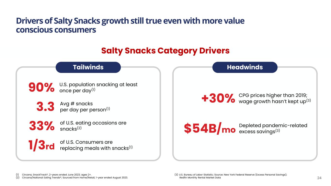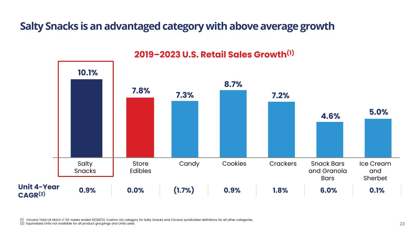 10.1% 7.8% 7.3% 8.7% 7.2% 4.6% 5.0% Salty Snacks Store Edibles Candy Cookies Crackers Snack Bars and Granola Bars Ice Cream and Sherbet Salty Snacks is an advantaged category with above average growth 23 (1) Circana Total US MULO-C 52-weeks ended 10/08/23. Custom Utz category for Salty Snacks and Circana syndicated definitions for all other categories. (2) Equivalized Units not available for all product groupings and Units used. 2019–2023 U.S. Retail Sales Growth(1) 0.9% 0.0% (1.7%) 0.9% 1.8% 6.0% 0.1%Unit 4-Year CAGR(2)