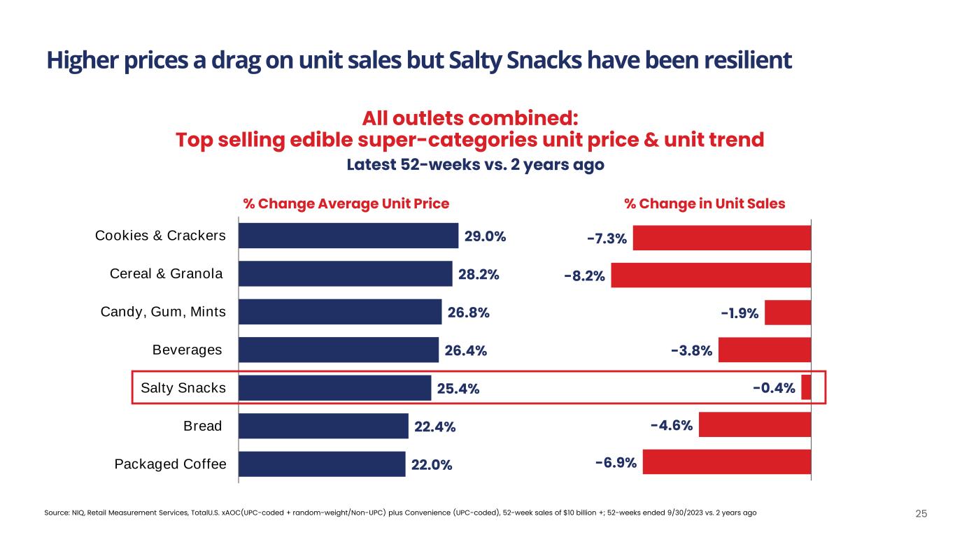 Drivers of Salty Snacks growth still true even with more value conscious consumers 24 Salty Snacks Category Drivers Tailwinds 90% U.S. population snacking at least once per day(1) 3.3 Avg # snacks per day per person(1) 33% of U.S. eating occasions are snacks(2) 1/3rd of U.S. Consumers are replacing meals with snacks(1) Headwinds +30% CPG prices higher than 2019; wage growth hasn’t kept up(3) $54B/mo Depleted pandemic-related excess savings(3)