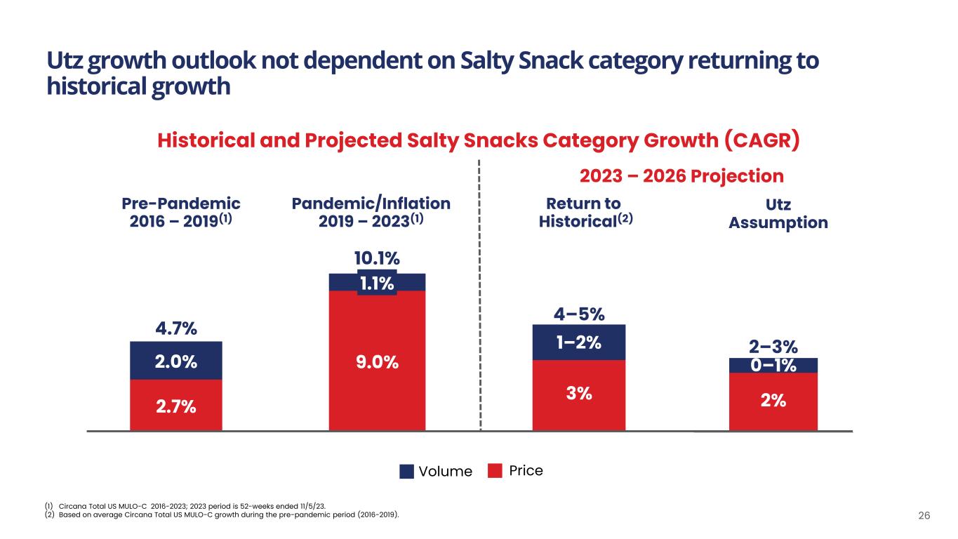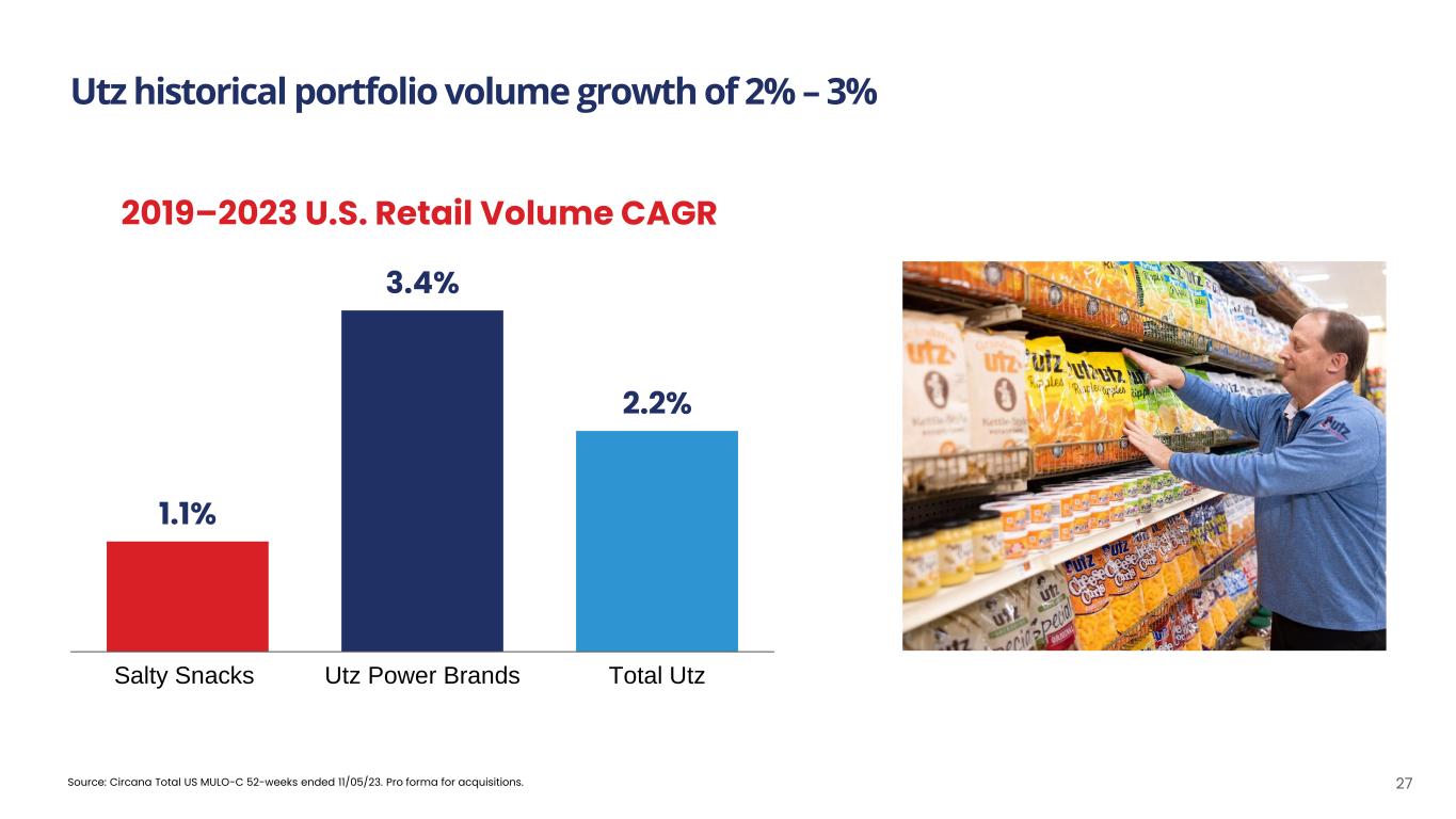 Historical and Projected Salty Snacks Category Growth (CAGR) Utz growth outlook not dependent on Salty Snack category returning to historical growth 26 Utz Assumption Return to Historical(2) Pre-Pandemic 2016 – 2019(1) Pandemic/Inflation 2019 – 2023(1) 2023 – 2026 Projection (1) Circana Total US MULO-C 2016-2023; 2023 period is 52-weeks ended 11/5/23. (2) Based on average Circana Total US MULO-C growth during the pre-pandemic period (2016-2019). 2.0% 2.7% 4.7% 1.1% 9.0% 10.1% 2–3% 0–1% 2% 4–5% 1–2% 3% Volume Price