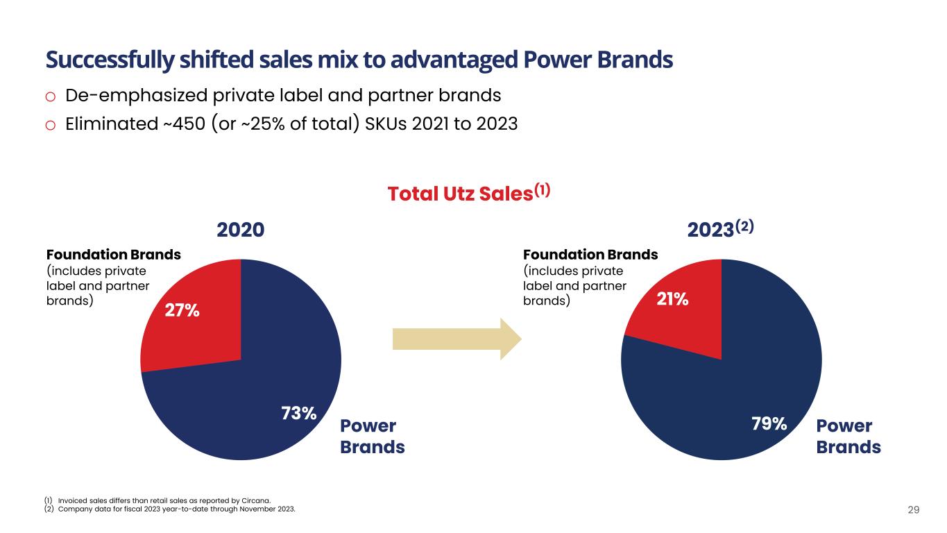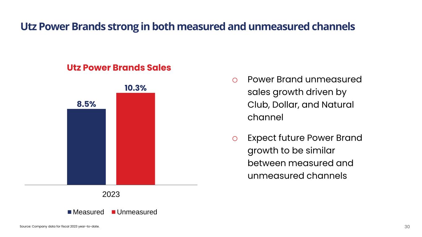 Successfully shifted sales mix to advantaged Power Brands 29 Power Brands Foundation Brands (includes private label and partner brands) 73% 27% 2020 79% 21% 2023(2) Total Utz Sales(1) (1) Invoiced sales differs than retail sales as reported by Circana. (2) Company data for fiscal 2023 year-to-date through November 2023. Power Brands o De-emphasized private label and partner brands o Eliminated ~450 (or ~25% of total) SKUs 2021 to 2023 Foundation Brands (includes private label and partner brands)