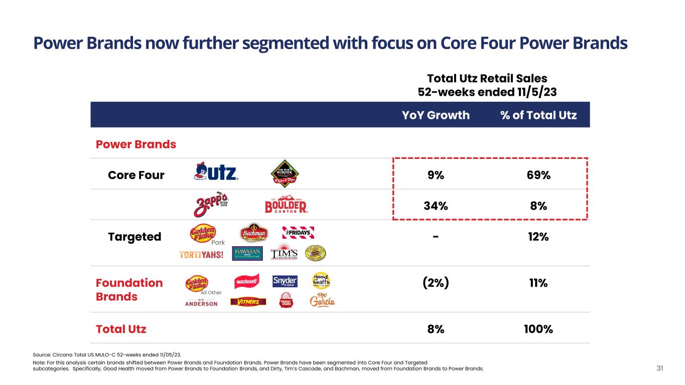 Utz Power Brands strong in both measured and unmeasured channels 30 8.5% 10.3% 2023 Measured Unmeasured Utz Power Brands Sales o Power Brand unmeasured sales growth driven by Club, Dollar, and Natural channel o Expect future Power Brand growth to be similar between measured and unmeasured channels Source: Company data for fiscal 2023 year-to-date.
