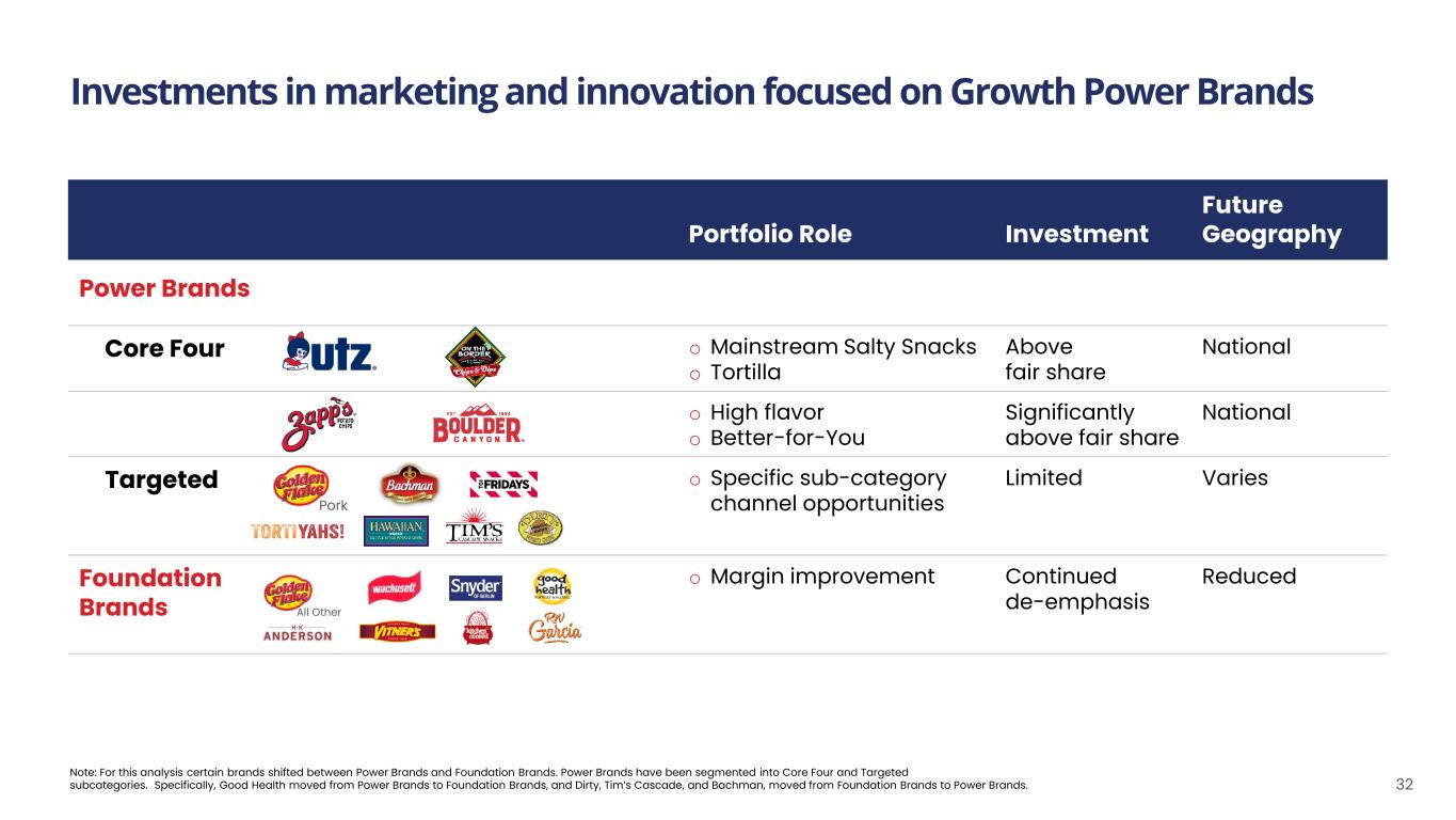 Total Utz Retail Sales 52-weeks ended 11/5/23 YoY Growth % of Total Utz Power Brands Core Four 9% 69% 34% 8% Targeted - 12% Foundation Brands (2%) 11% Total Utz 8% 100% Power Brands now further segmented with focus on Core Four Power Brands 31 Note: For this analysis certain brands shifted between Power Brands and Foundation Brands. Power Brands have been segmented into Core Four and Targeted subcategories. Specifically, Good Health moved from Power Brands to Foundation Brands, and Dirty, Tim’s Cascade, and Bachman, moved from Foundation Brands to Power Brands. Source: Circana Total US MULO-C 52-weeks ended 11/05/23. Pork All Other