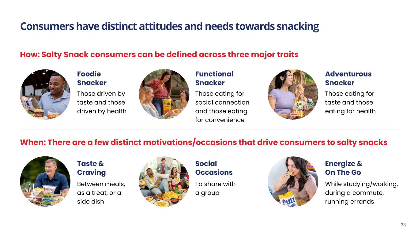 Portfolio Role Investment Future Geography Power Brands Core Four o Mainstream Salty Snacks o Tortilla Above fair share National o High flavor o Better-for-You Significantly above fair share National Targeted o Specific sub-category channel opportunities Limited Varies Foundation Brands o Margin improvement Continued de-emphasis Reduced Investments in marketing and innovation focused on Growth Power Brands 32 Pork All Other Note: For this analysis certain brands shifted between Power Brands and Foundation Brands. Power Brands have been segmented into Core Four and Targeted subcategories. Specifically, Good Health moved from Power Brands to Foundation Brands, and Dirty, Tim’s Cascade, and Bachman, moved from Foundation Brands to Power Brands.