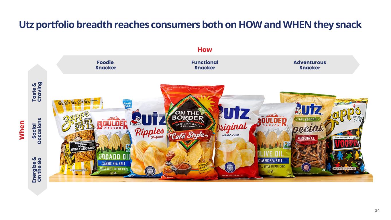 Consumers have distinct attitudes and needs towards snacking 33 How: Salty Snack consumers can be defined across three major traits Adventurous Snacker Functional Snacker Foodie Snacker Those driven by taste and those driven by health Those eating for taste and those eating for health Those eating for social connection and those eating for convenience When: There are a few distinct motivations/occasions that drive consumers to salty snacks Between meals, as a treat, or a side dish While studying/working, during a commute, running errands To share with a group Taste & Craving Social Occasions Energize & On The Go