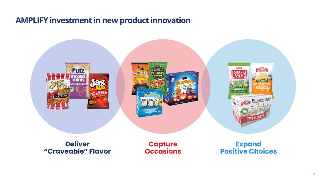 18% 18% 19% 20% 20%19% 19% 22% 22% 25% 7/16/2023 8/13/2023 9/10/2023 10/8/2023 11/5/2023 Salty Snacks Utz Brands Ecommerce Retail Sales Growth Rolling 12-week periods year-over-year change AMPLIFY investment in digital commerce capabilities 38Source: Circana Total E-Commerce With ePOS rolling 12-weeks; note: Circana eComm data utilizes their standard hierarchy.