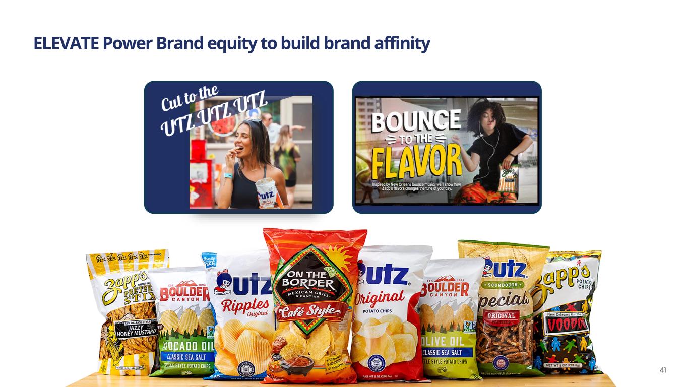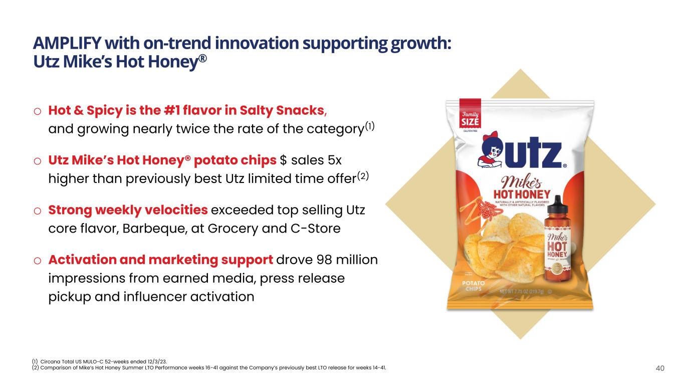 AMPLIFY with on-trend innovation supporting growth: Utz Mike’s Hot Honey® 40 o Hot & Spicy is the #1 flavor in Salty Snacks, and growing nearly twice the rate of the category(1) o Utz Mike’s Hot Honey® potato chips $ sales 5x higher than previously best Utz limited time offer(2) o Strong weekly velocities exceeded top selling Utz core flavor, Barbeque, at Grocery and C-Store o Activation and marketing support drove 98 million impressions from earned media, press release pickup and influencer activation (1) Circana Total US MULO-C 52-weeks ended 12/3/23. (2) Comparison of Mike’s Hot Honey Summer LTO Performance weeks 16-41 against the Company’s previously best LTO release for weeks 14-41.