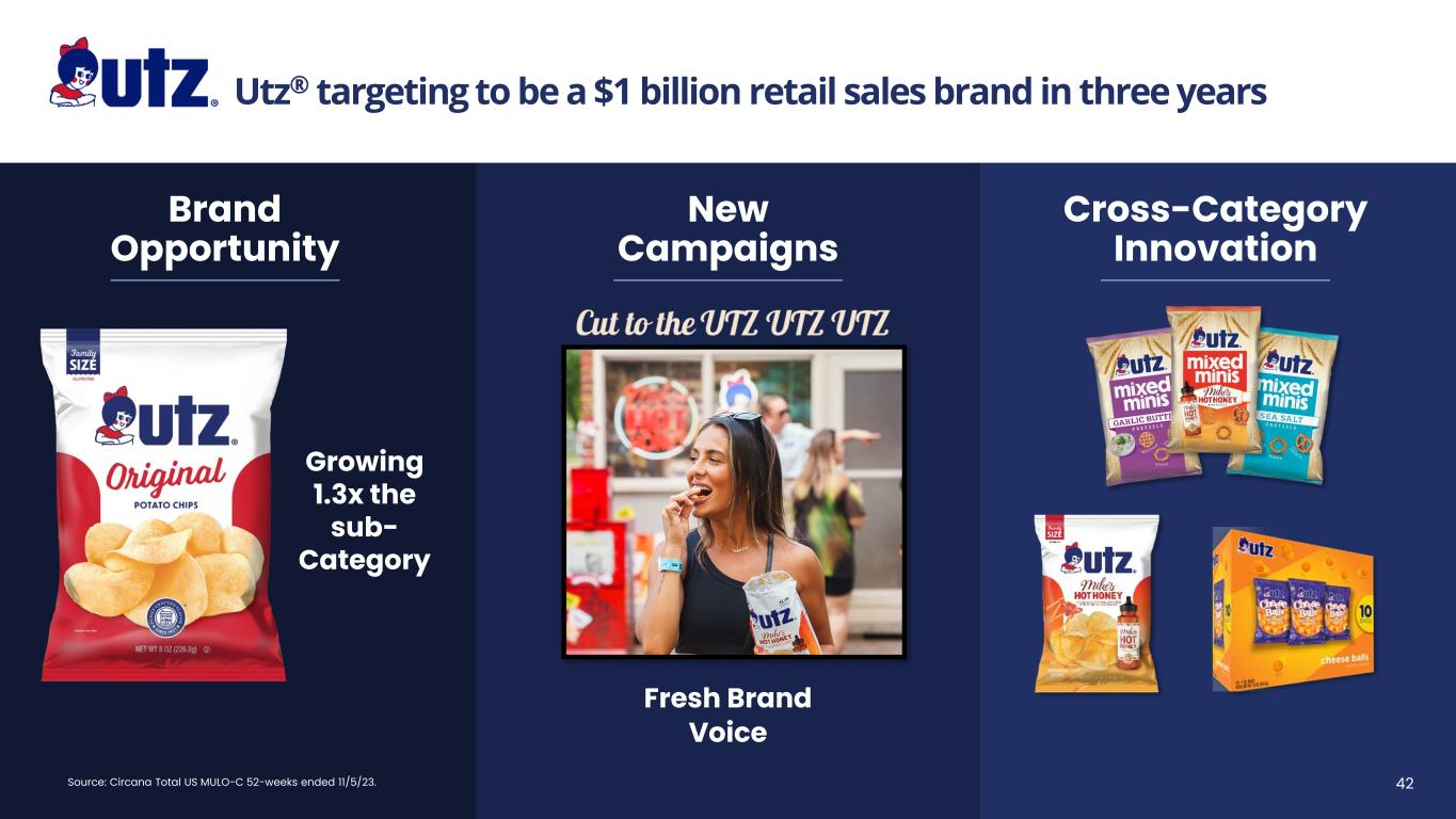 Disclaimer 2 Forward-Looking Statements Certain statements made herein are not historical facts but are “forward-looking statements” within the meaning of the “safe harbor” provisions of the Private Securities Litigation Reform Act of 1995, as amended. The forward-looking statements generally are accompanied by or include, without limitation, statements such as “will”, “expect”, “intends”, “goal” or other similar words, phrases or expressions. These forward-looking statements include the expected effects from the COVID-19 pandemic; future plans for the Utz Brands, Inc. (“the Company”), including plans related transformation of the Company’s supply chain, the Company’s geographic expansion, the Company’s product offerings and product mix, the Company’s ESG priorities, the Company’s cost savings plans and the Company’s logistics optimization efforts; the estimated or anticipated future results and benefits of the Company’s plans and operations; future capital structure; future opportunities for the Company; the effects of inflation or supply chain disruptions; statements regarding the Company’s project balance sheet and liabilities, including net leverage; and other statements that are not historical facts. These statements are based on the current expectations of the Company’s management and are not predictions of actual performance. These statements are subject to a number of risks and uncertainties and the Company’s business and actual results may differ materially. Factors that may cause such differences include, but are not limited to: the risk that the Company’s gross profit margins may be adversely impacted by a variety of factors, including variations in raw materials pricing, retail customer requirements and mix, sales velocities and required promotional support; changes in consumers’ loyalty to the Company’s brands due to factors beyond the Company’s control, including changes in consumer spending due to factors such as increasing household debt; changes in demand for the Company’s products affected by changes in consumer preferences and tastes or if the Company is unable to innovate or market its products effectively, particularly in the Company’s Expansion geographies; costs associated with building brand loyalty and interest in the Company’s products, which may be affected by actions by the Company’s competitors’ that result in the Company’s products not suitably differentiated from the products of their competitors; consolidation of key suppliers to the Company; inability of the Company to adopt efficiencies into its manufacturing processes, including automation and labor optimization, its network, including through plant consolidation and lowest landed cost for shipping its products, or its logistics operation; fluctuations in results of operations of the Company from quarter to quarter because of changes in promotional activities; the possibility that the Company may be adversely affected by other economic, business or competitive factors; the risk that the Company may not recognize the anticipated benefits of recently completed business combinations and other acquisitions recently completed by the Company (collectively, the “Business Combinations”), which may be affected by, among other things, competition and the ability of the Company to grow and manage growth profitably and retain its key employees; the ability of the Company to close planned acquisitions; changes in applicable law or regulations; costs related to the Business Combinations and other planned acquisitions; the inability of the Company to maintain the listing of the Company’s Class A Common Stock on the New York Stock Exchange; the inability of the Company to develop and maintain effective internal controls; and other risks and uncertainties set forth in the section entitled “Risk Factors” and “Forward-Looking Statements” in the Company’s Annual Report on Form 10-K filed with the U.S. Securities and Exchange Commission (the “Commission”) for the fiscal year ended January 1, 2023, and other reports filed by the Company with the Commission. In addition, forward-looking statements provide the Company’s expectations, plans or forecasts of future events and views as of the date of this communication. These forward-looking statements should not be relied upon as representing the Company’s assessments as of any date subsequent to the date of this communication. The Company cautions investors not to place undue reliance upon any forward-looking statements, which speak only as of the date made. The Company does not undertake or accept any obligation or undertaking to release publicly any updates or revisions to any forward-looking statements to reflect any change in its expectations or any change in events, conditions or circumstances on which any such statement is based, except as otherwise required by law. No Offer or Solicitation This presentation does not constitute a solicitation of a proxy, consent or authorization with respect to any securities of the Company. This presentation also does not constitute an offer to sell or the solicitation of an offer to buy securities, nor will there be any sale of securities in any state or jurisdiction in which such offer, solicitation or sale would be unlawful prior to registration or qualification under the securities laws of any such jurisdiction. No offering of securities will be made except by means of a prospectus meeting the requirements of the Securities Act of 1933, as amended, or an exemption therefrom.