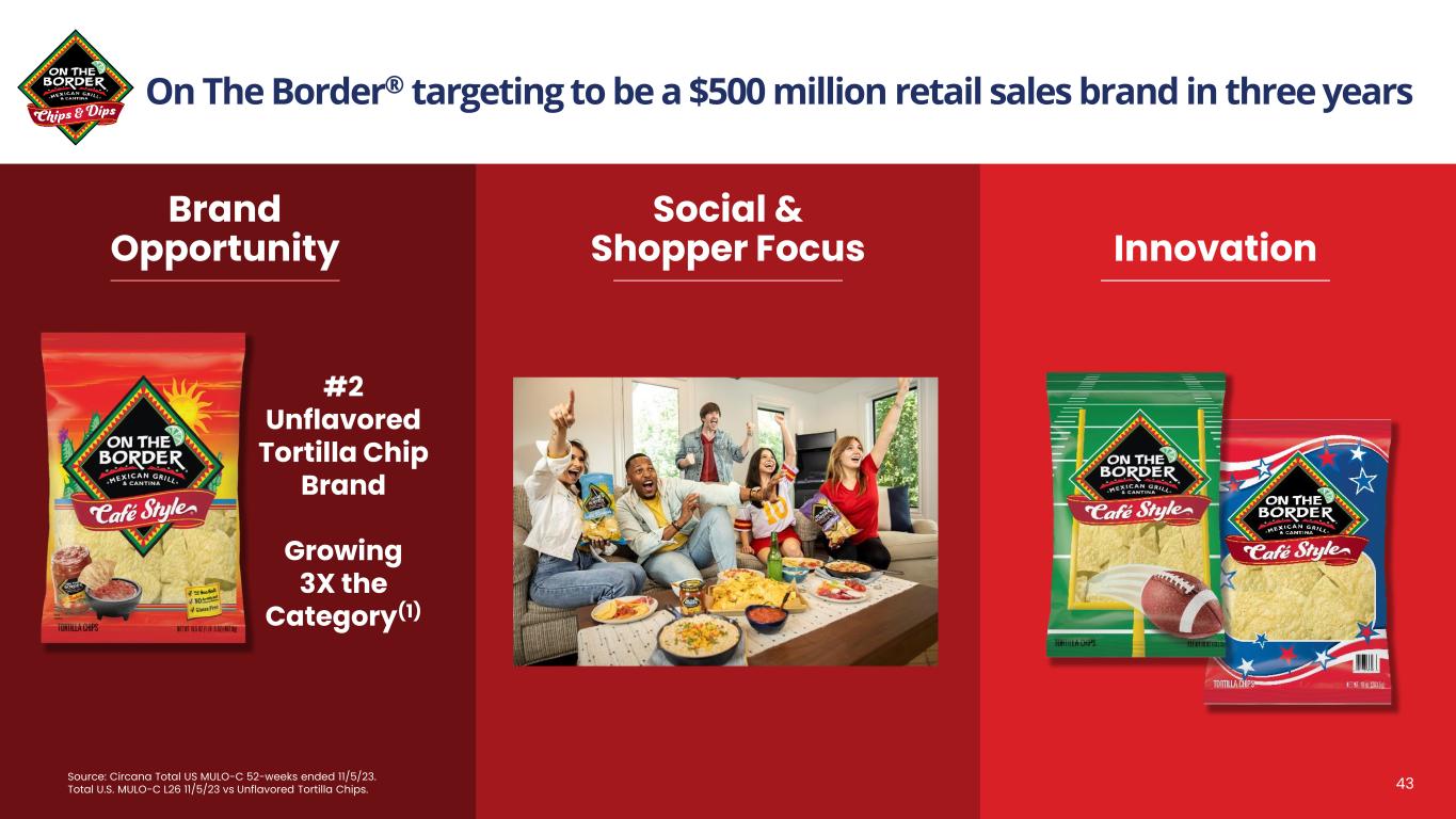 Brand Opportunity Social & Shopper Focus Innovation On The Border® targeting to be a $500 million retail sales brand in three years 43 #2 Unflavored Tortilla Chip Brand Growing 3X the Category(1) Source: Circana Total US MULO-C 52-weeks ended 11/5/23. Total U.S. MULO-C L26 11/5/23 vs Unflavored Tortilla Chips.