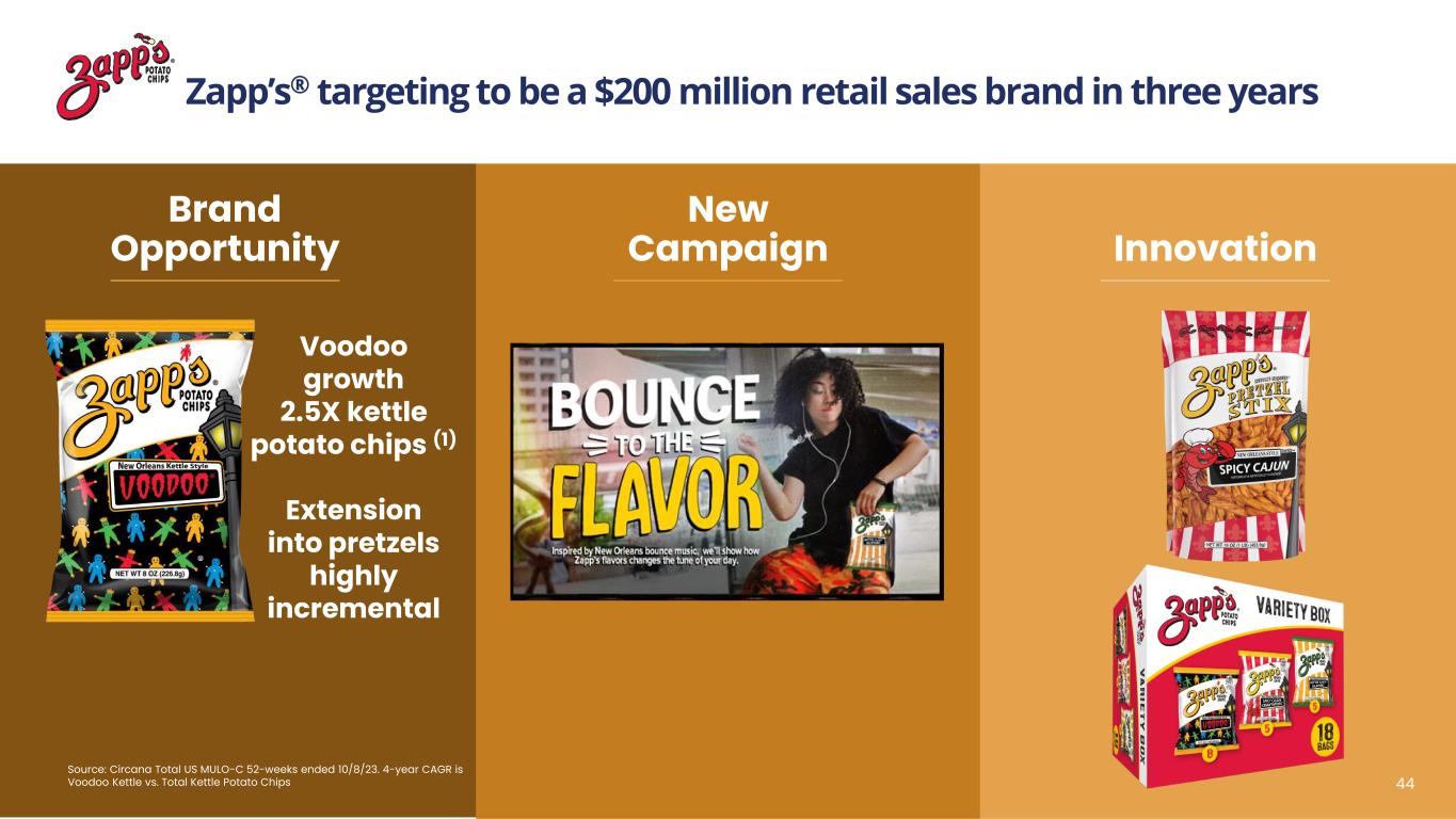Brand Opportunity New Campaign Innovation Zapp’s® targeting to be a $200 million retail sales brand in three years 44 Voodoo growth 2.5X kettle potato chips (1) Extension into pretzels highly incremental Source: Circana Total US MULO-C 52-weeks ended 10/8/23. 4-year CAGR is Voodoo Kettle vs. Total Kettle Potato Chips
