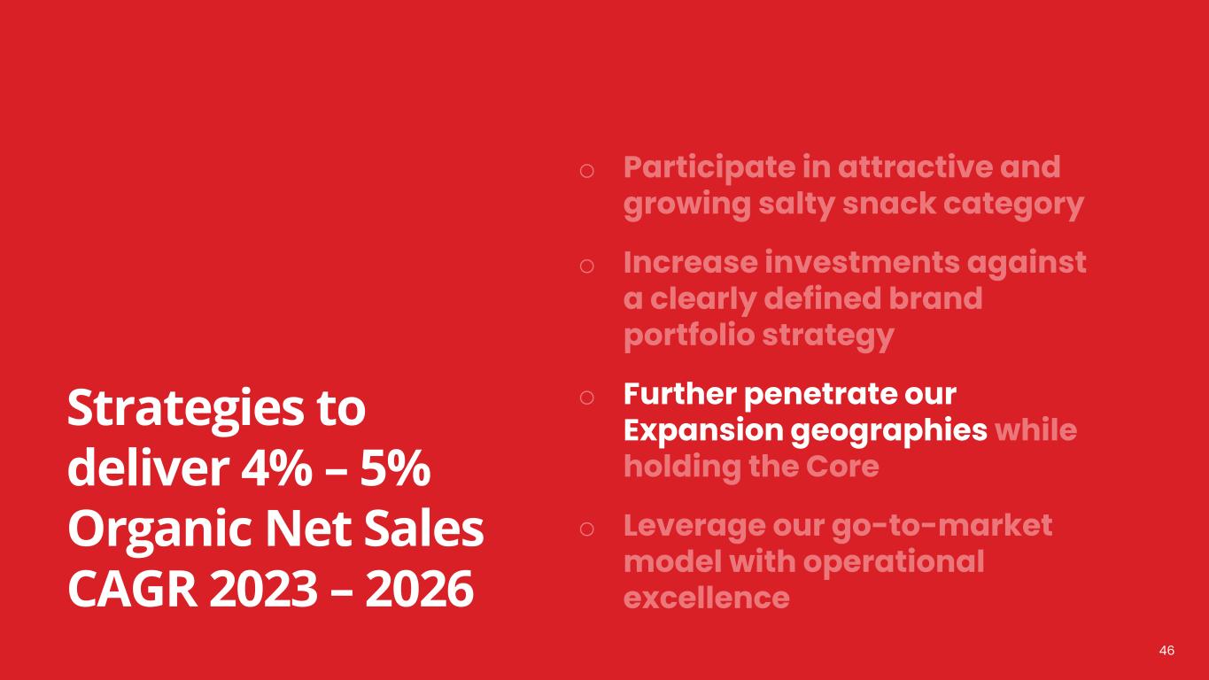 46 o Participate in attractive and growing salty snack category o Increase investments against a clearly defined brand portfolio strategy o Further penetrate our Expansion geographies while holding the Core o Leverage our go-to-market model with operational excellence Strategies to deliver 4% – 5% Organic Net Sales CAGR 2023 – 2026