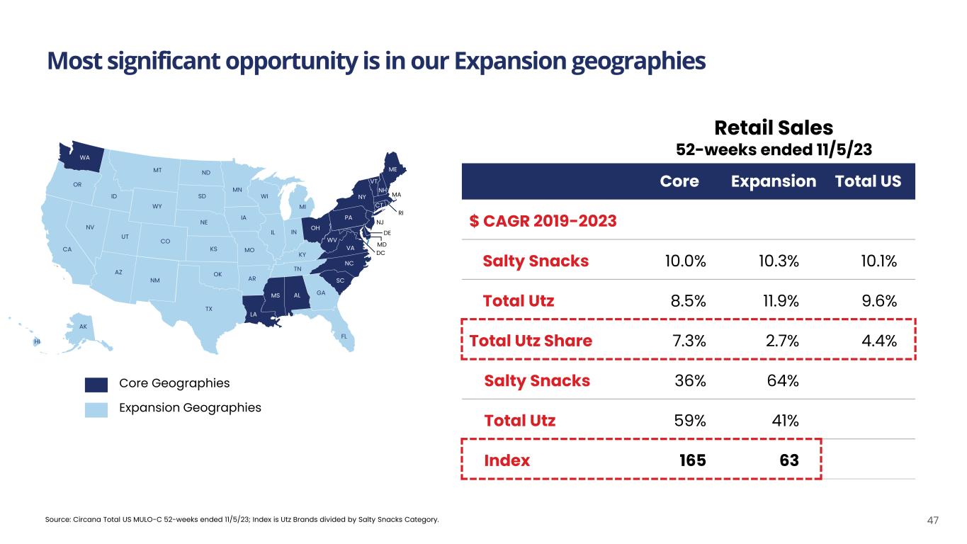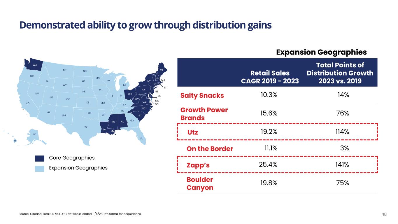 Retail Sales 52-weeks ended 11/5/23 Core Expansion Total US $ CAGR 2019-2023 Salty Snacks 10.0% 10.3% 10.1% Total Utz 8.5% 11.9% 9.6% Total Utz Share 7.3% 2.7% 4.4% Salty Snacks 36% 64% Total Utz 59% 41% Index 165 63 Most significant opportunity is in our Expansion geographies 47Source: Circana Total US MULO-C 52-weeks ended 11/5/23; Index is Utz Brands divided by Salty Snacks Category. FL NM DE MD TX OK KS NE SD NDMT WY CO UT ID AZ NV WA CA OR KY ME NY PA VT NH MA RI CT WV INIL NC TN SC ALMS AR LA MO IA MN WI NJ GA DC VA OH MI HI AK Core Geographies Expansion Geographies