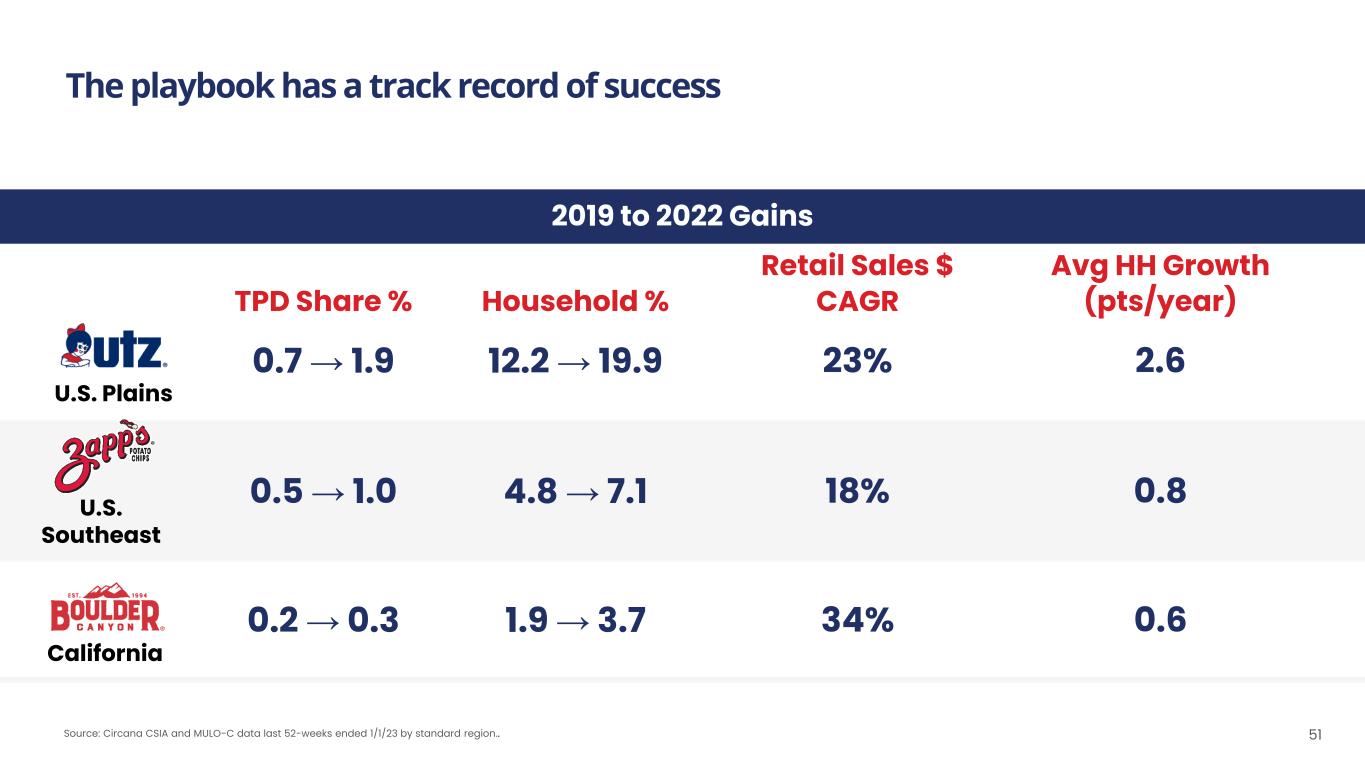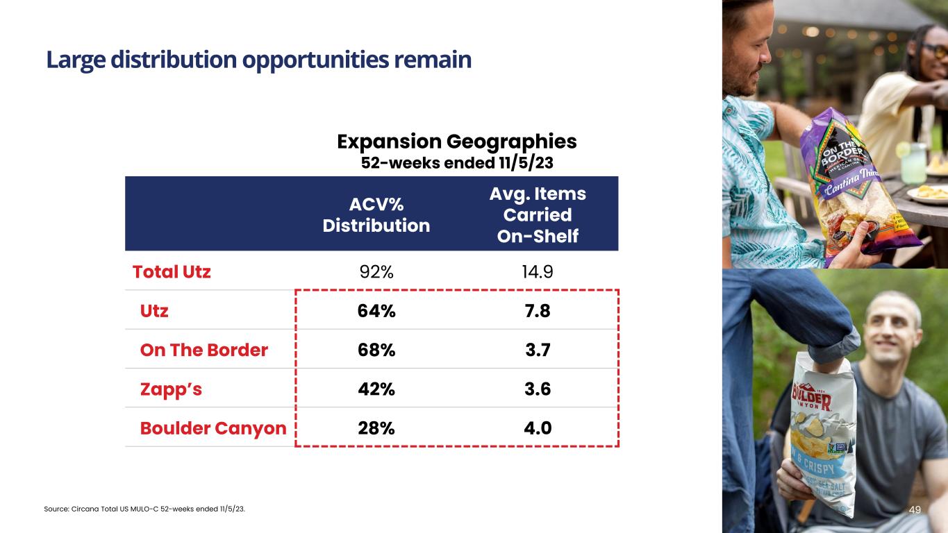 Demonstrated ability to grow through distribution gains 48Source: Circana Total US MULO-C 52-weeks ended 11/5/23. Pro forma for acquisitions. Expansion Geographies Retail Sales CAGR 2019 - 2023 Total Points of Distribution Growth 2023 vs. 2019 Salty Snacks 10.3% 14% Growth Power Brands 15.6% 76% Utz 19.2% 114% On the Border 11.1% 3% Zapp’s 25.4% 141% Boulder Canyon 19.8% 75% FL NM DE MD TX OK KS NE SD NDMT WY CO UT ID AZ NV WA CA OR KY ME NY PA VT NH MA RI CT WV INIL NC TN SC ALMS AR LA MO IA MN WI NJ GA DC VA OH MI HI AK Core Geographies Expansion Geographies