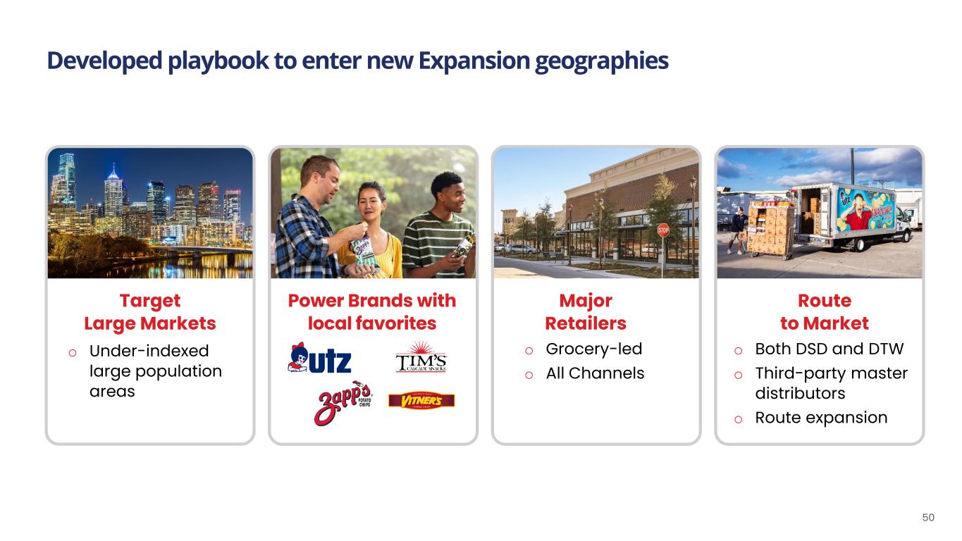 Expansion Geographies 52-weeks ended 11/5/23 ACV% Distribution Avg. Items Carried On-Shelf Total Utz 92% 14.9 Utz 64% 7.8 On The Border 68% 3.7 Zapp’s 42% 3.6 Boulder Canyon 28% 4.0 Large distribution opportunities remain Source: Circana Total US MULO-C 52-weeks ended 11/5/23. 49