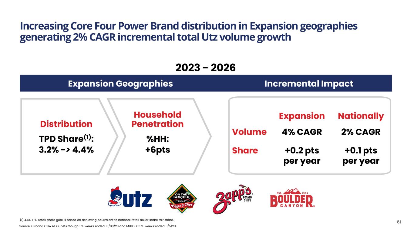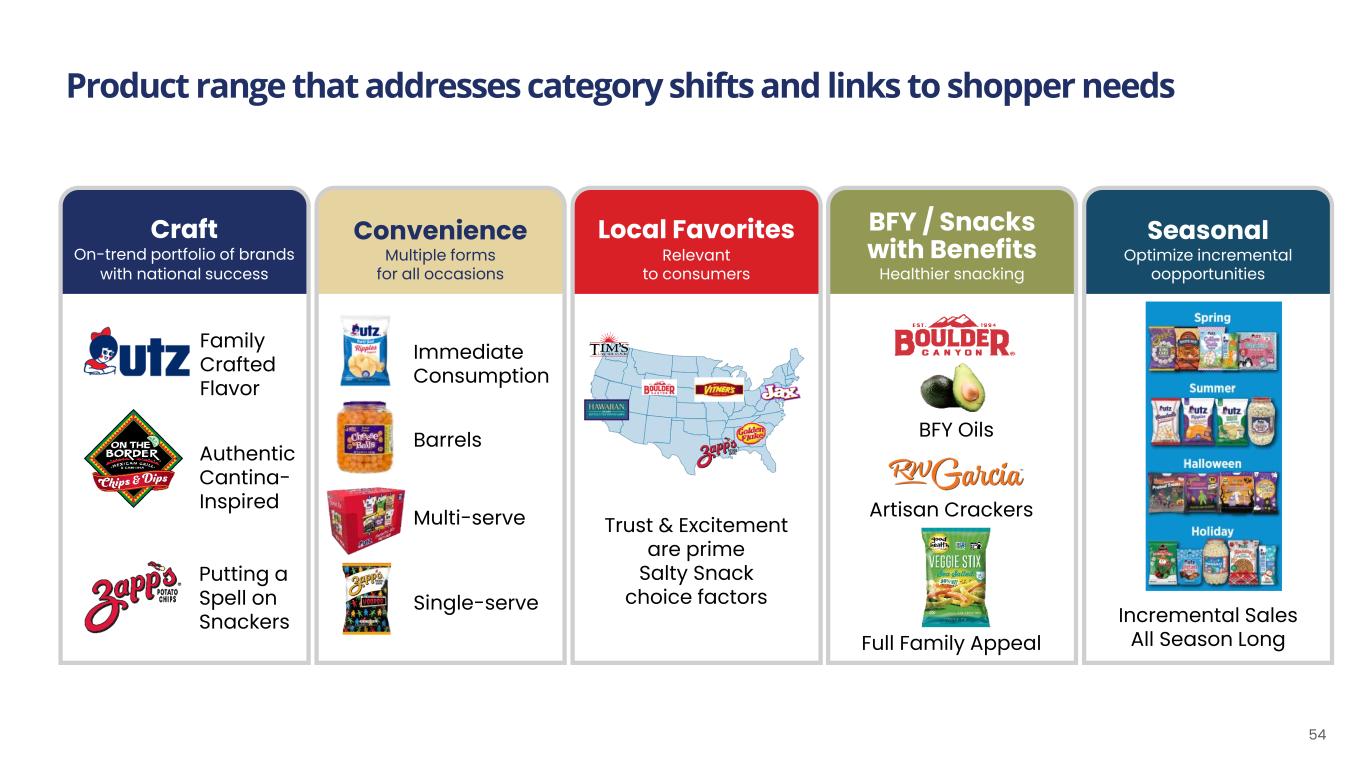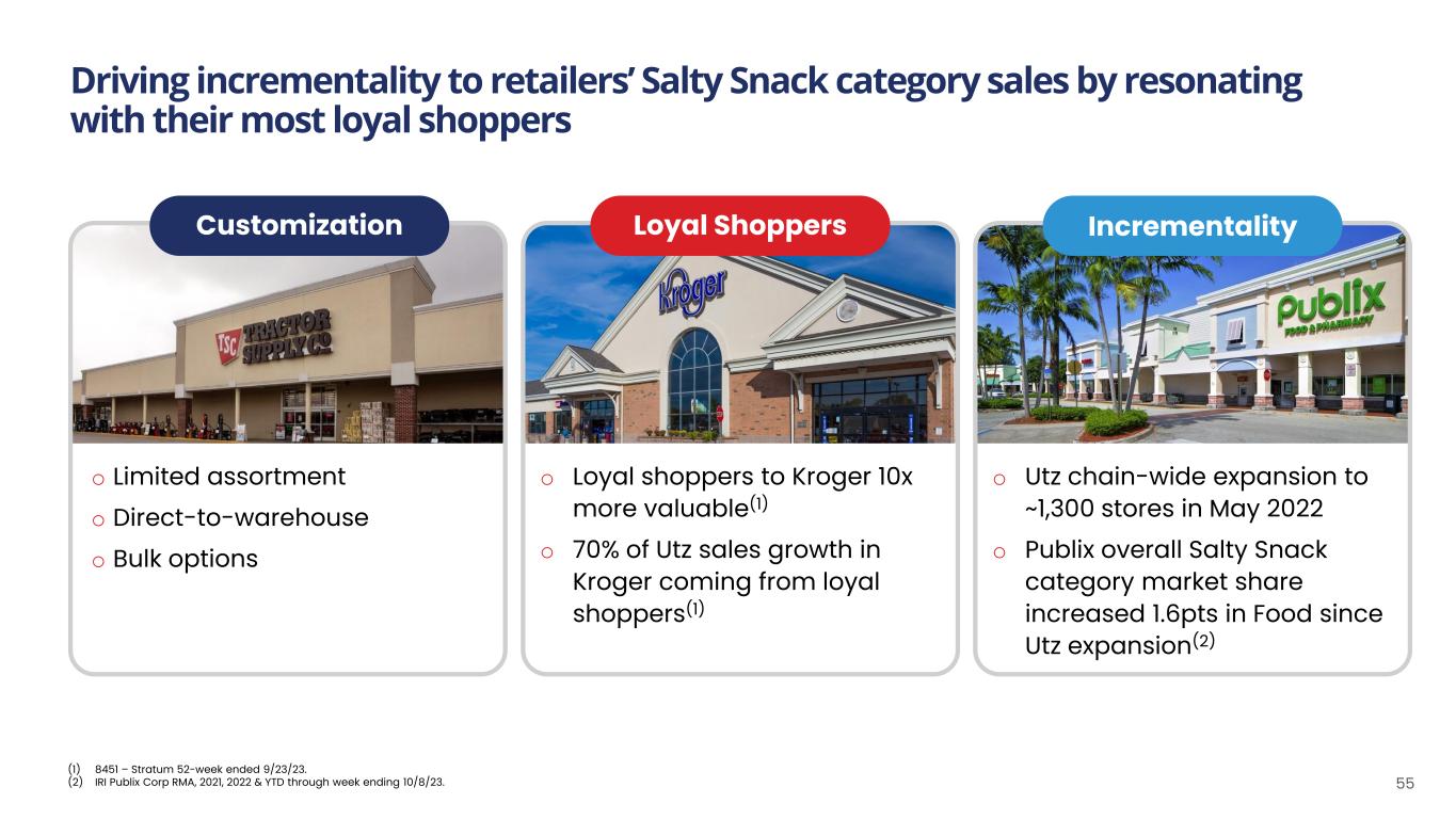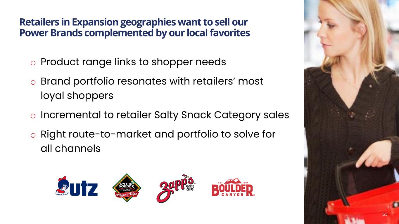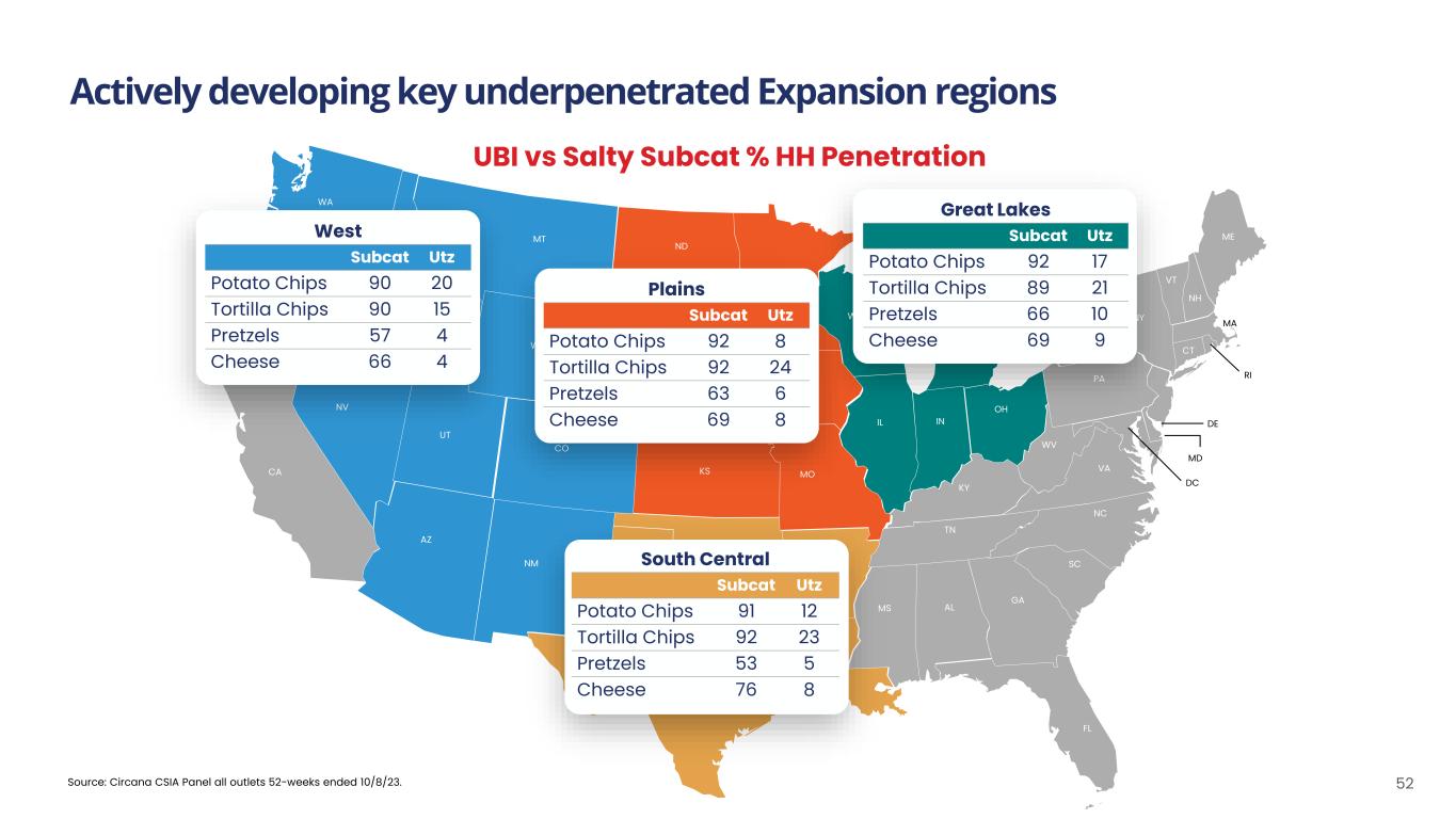 VT VA W I FL NM DE MD TX OK KS NE SD ND MT WY CO UT ID AZ NV WA CA OR KY ME NY PA T NH MA RI CT WV INIL NC TN SC ALMS AR LA MO IA MN WI NJ GA DC VA OH MI Actively developing key underpenetrated Expansion regions 52 West Subcat Utz Potato Chips 90 20 Tortilla Chips 90 15 Pretzels 57 4 Cheese 66 4 UBI vs Salty Subcat % HH Penetration Great Lakes Subcat Utz Potato Chips 92 17 Tortilla Chips 89 21 Pretzels 66 10 Cheese 69 9 Source: Circana CSIA Panel all outlets 52-weeks ended 10/8/23. Plains Subcat Utz Potato Chips 92 8 Tortilla Chips 92 24 Pretzels 63 6 Cheese 69 8 South Central Subcat Utz Potato Chips 91 12 Tortilla Chips 92 23 Pretzels 53 5 Cheese 76 8