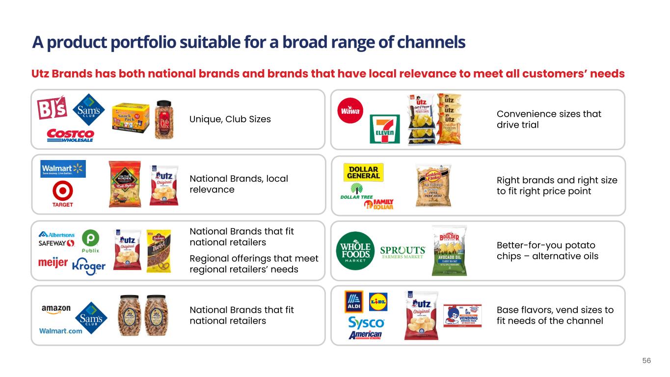 Driving incrementality to retailers’ Salty Snack category sales by resonating with their most loyal shoppers o Limited assortment o Direct-to-warehouse o Bulk options o Loyal shoppers to Kroger 10x more valuable(1) o 70% of Utz sales growth in Kroger coming from loyal shoppers(1) o Utz chain-wide expansion to ~1,300 stores in May 2022 o Publix overall Salty Snack category market share increased 1.6pts in Food since Utz expansion(2) 55 (1) 8451 – Stratum 52-week ended 9/23/23. (2) IRI Publix Corp RMA, 2021, 2022 & YTD through week ending 10/8/23. Customization Loyal Shoppers Incrementality