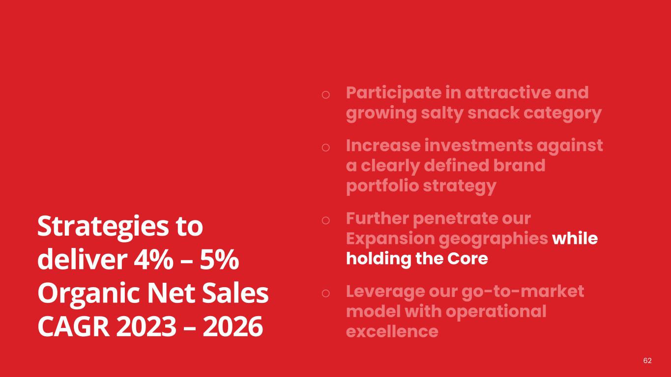 62 o Participate in attractive and growing salty snack category o Increase investments against a clearly defined brand portfolio strategy o Further penetrate our Expansion geographies while holding the Core o Leverage our go-to-market model with operational excellence Strategies to deliver 4% – 5% Organic Net Sales CAGR 2023 – 2026