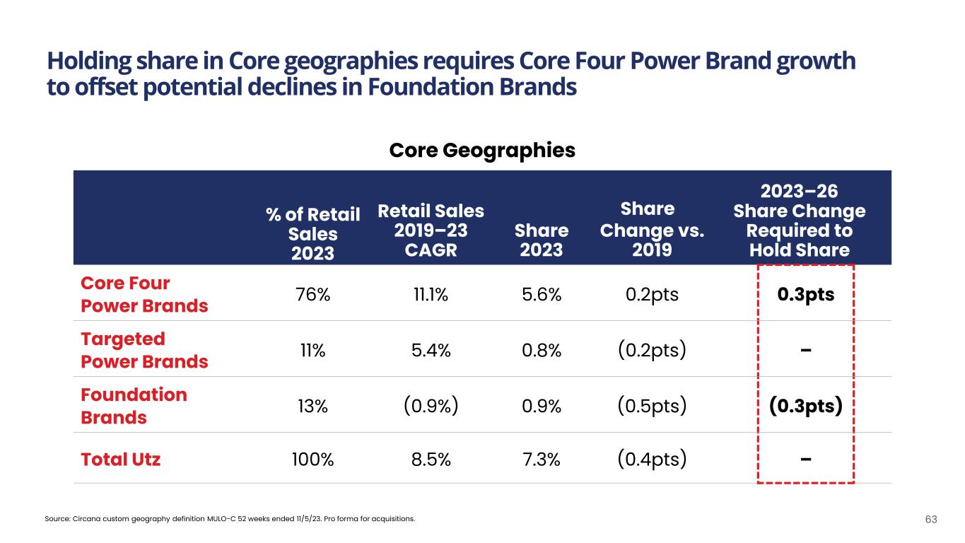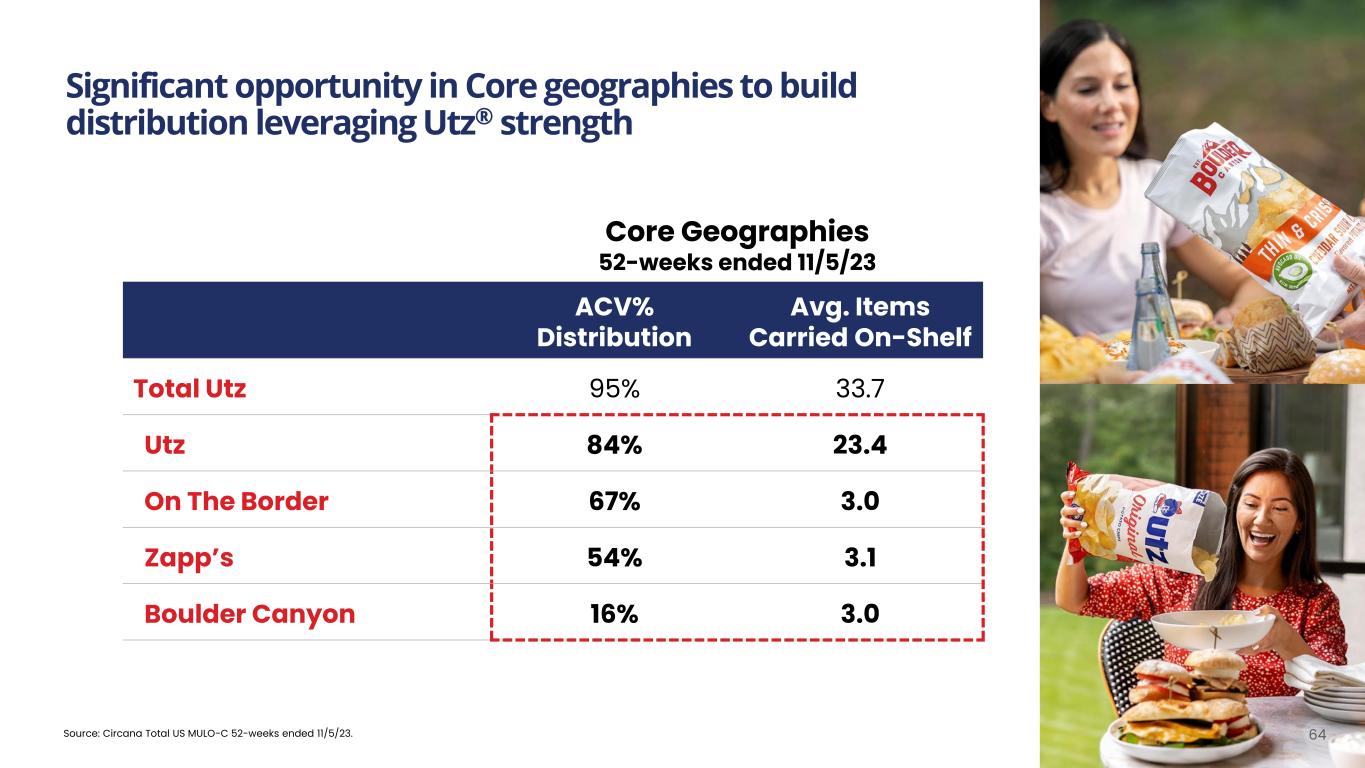 Core Geographies % of Retail Sales 2023 Retail Sales 2019–23 CAGR Share 2023–26 Share Change Required to Hold Share Share 2023 Change vs. 2019 Core Four Power Brands 76% 11.1% 5.6% 0.2pts 0.3pts Targeted Power Brands 11% 5.4% 0.8% (0.2pts) – Foundation Brands 13% (0.9%) 0.9% (0.5pts) (0.3pts) Total Utz 100% 8.5% 7.3% (0.4pts) – Holding share in Core geographies requires Core Four Power Brand growth to offset potential declines in Foundation Brands 63Source: Circana custom geography definition MULO-C 52 weeks ended 11/5/23. Pro forma for acquisitions.