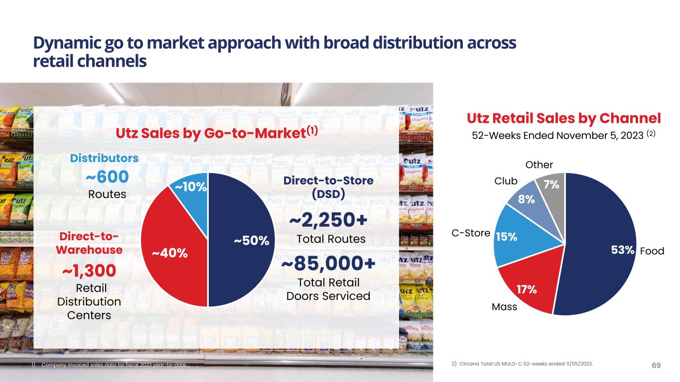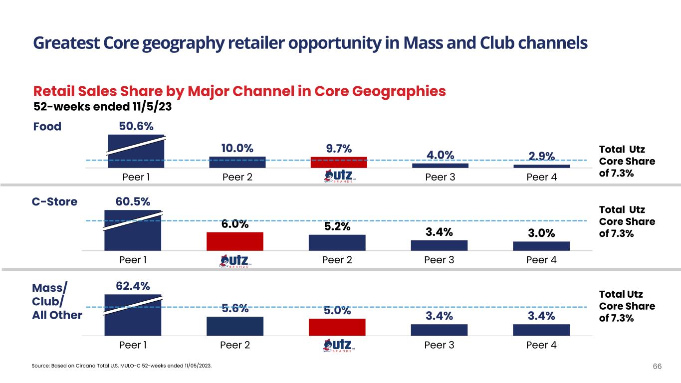 Peer 1 Peer 2 Peer 3 Peer 4 60.5% 6.0% 5.2% 3.4% 3.0% Retail Sales Share by Major Channel in Core Geographies 52-weeks ended 11/5/23 Peer 1 Peer 2 Peer 3 Peer 4 62.4% 5.6% 5.0% 3.4% 3.4% Food C-Store Mass/ Club/ All Other Greatest Core geography retailer opportunity in Mass and Club channels 66 Peer 1 Peer 2 Peer 3 Peer 4 50.6% 10.0% 9.7% 4.0% 2.9% ℠ ℠ ℠ Source: Based on Circana Total U.S. MULO-C 52-weeks ended 11/05/2023. Total Utz Core Share of 7.3% Total Utz Core Share of 7.3% Total Utz Core Share of 7.3%