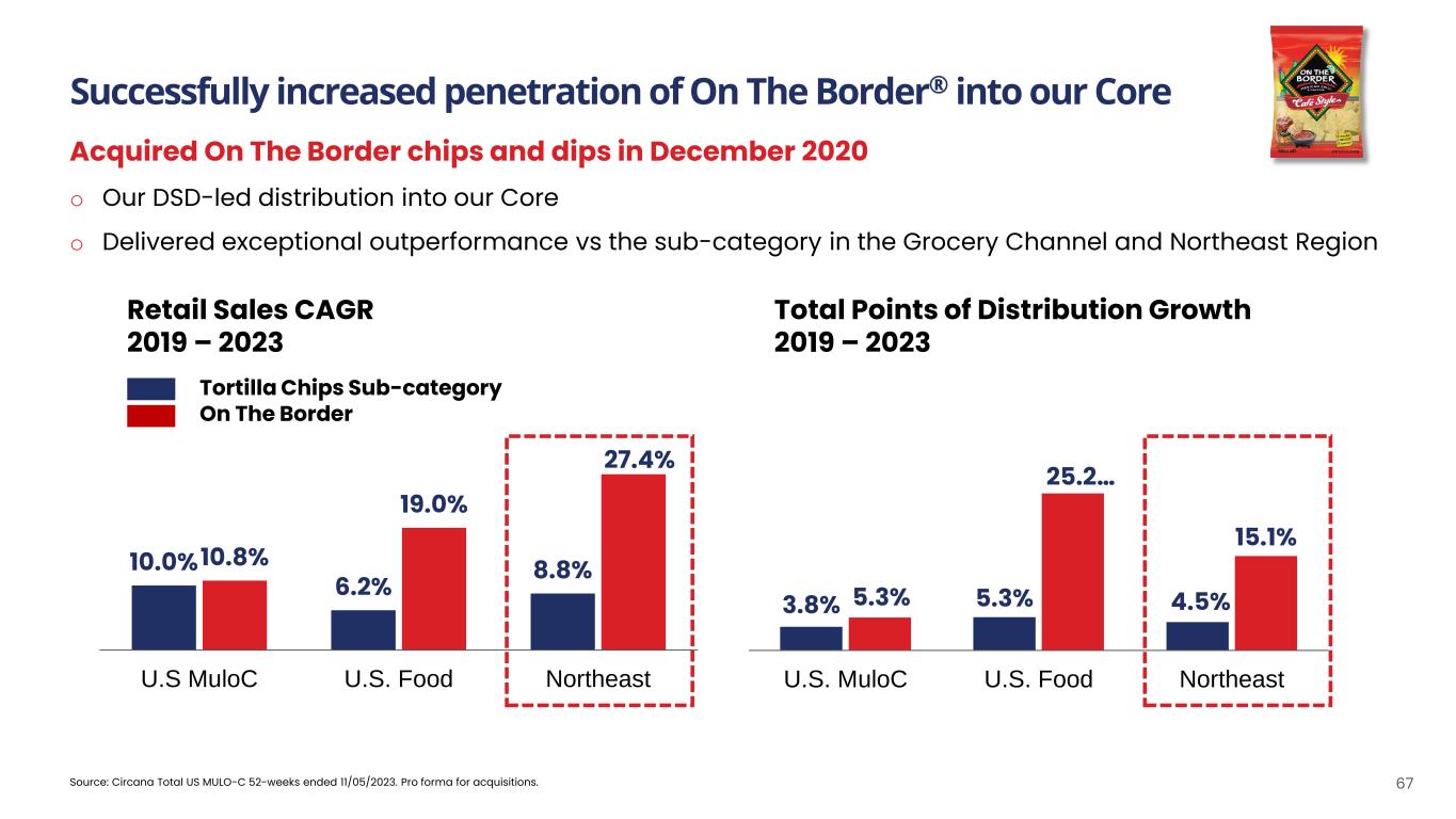 10.0% 6.2% 8.8%10.8% 19.0% 27.4% U.S MuloC U.S. Food Northeast Source: Circana Total US MULO-C 52-weeks ended 11/05/2023. Pro forma for acquisitions. Successfully increased penetration of On The Border® into our Core 67 3.8% 5.3% 4.5%5.3% 25.2… 15.1% U.S. MuloC U.S. Food Northeast Acquired On The Border chips and dips in December 2020 o Our DSD-led distribution into our Core o Delivered exceptional outperformance vs the sub-category in the Grocery Channel and Northeast Region Retail Sales CAGR 2019 – 2023 Total Points of Distribution Growth 2019 – 2023 Tortilla Chips Sub-category On The Border