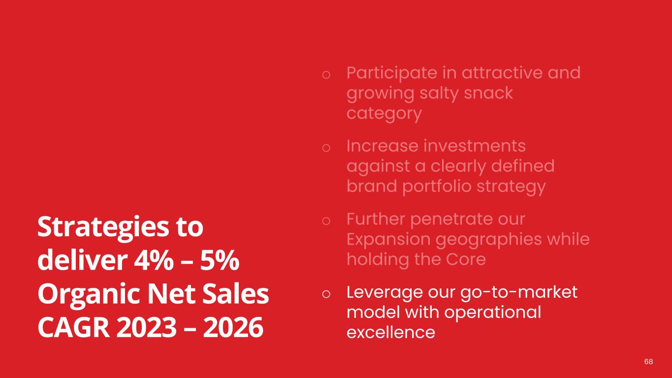 68 o Participate in attractive and growing salty snack category o Increase investments against a clearly defined brand portfolio strategy o Further penetrate our Expansion geographies while holding the Core o Leverage our go-to-market model with operational excellence Strategies to deliver 4% – 5% Organic Net Sales CAGR 2023 – 2026