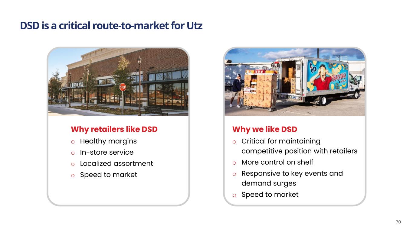 Dynamic go to market approach with broad distribution across retail channels 69 53% 17% 15% 8% 7% Food Mass C-Store Club Other 2) Circana Total US MULO-C 52-weeks ended 11/05/2023. Utz Retail Sales by Channel 52-Weeks Ended November 5, 2023 (2) 1) Company invoiced sales data for fiscal 2023 year-to-date. Utz Sales by Go-to-Market(1) ~50% ~40% ~10% Distributors ~600 Routes Direct-to- Warehouse ~1,300 Retail Distribution Centers Direct-to-Store (DSD) ~85,000+ Total Retail Doors Serviced ~2,250+ Total Routes