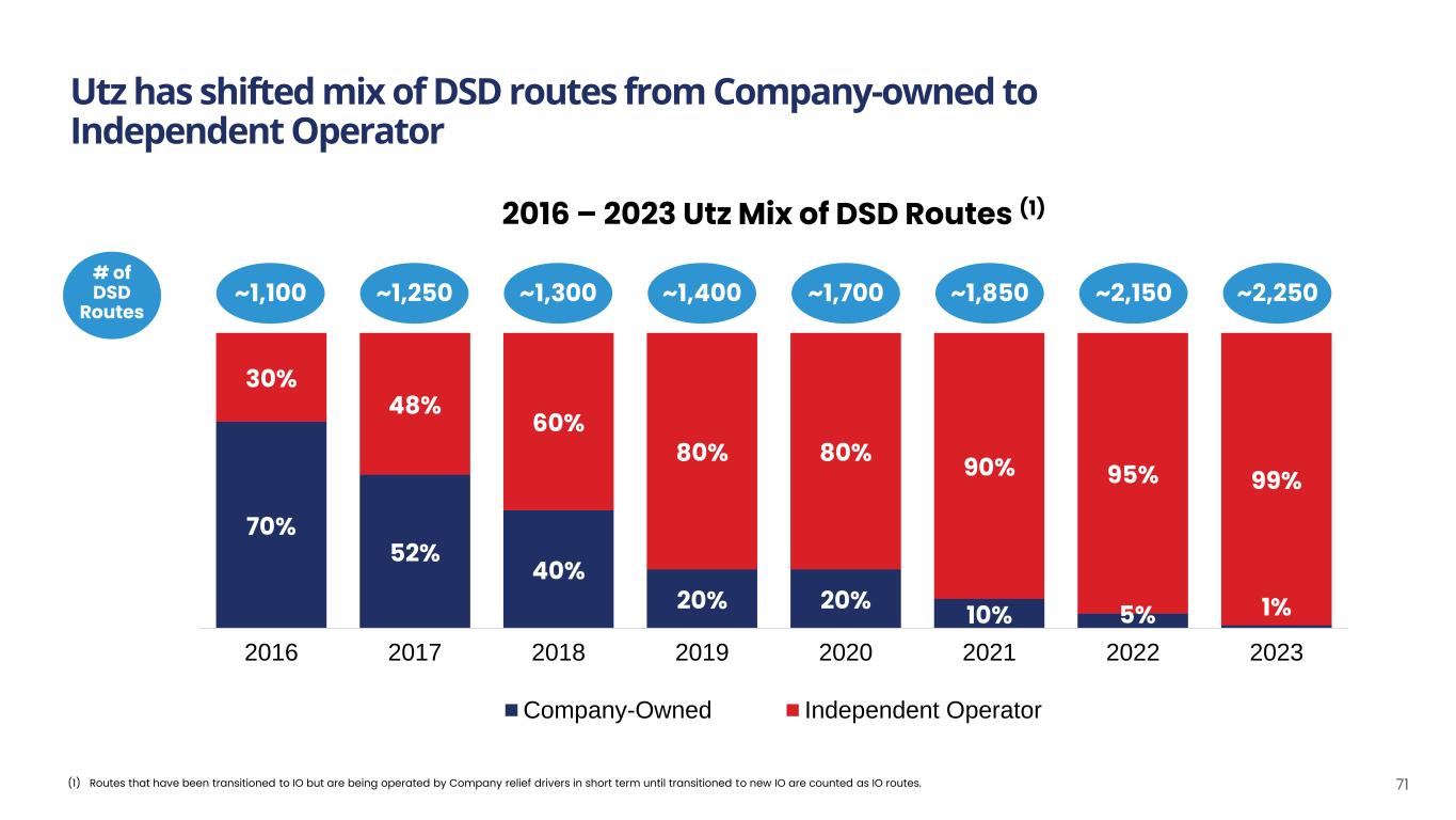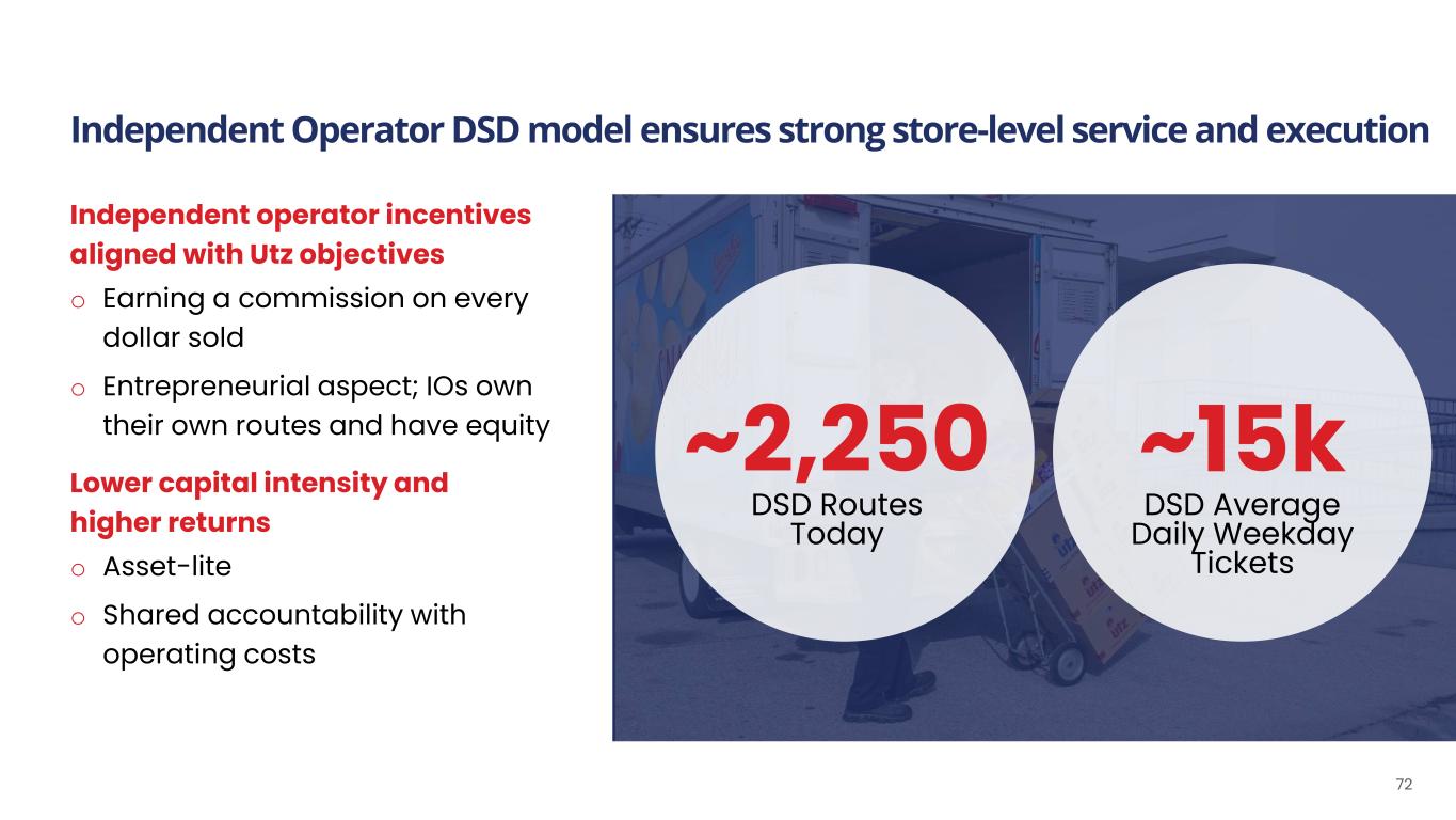 70% 52% 40% 20% 20% 10% 5% 1% 30% 48% 60% 80% 80% 90% 95% 99% 2016 2017 2018 2019 2020 2021 2022 2023 Company-Owned Independent Operator Utz has shifted mix of DSD routes from Company-owned to Independent Operator 71 2016 – 2023 Utz Mix of DSD Routes (1) # of DSD Routes (1) Routes that have been transitioned to IO but are being operated by Company relief drivers in short term until transitioned to new IO are counted as IO routes. ~1,100 ~1,250 ~1,400 ~1,700 ~1,850 ~2,150 ~2,250~1,300