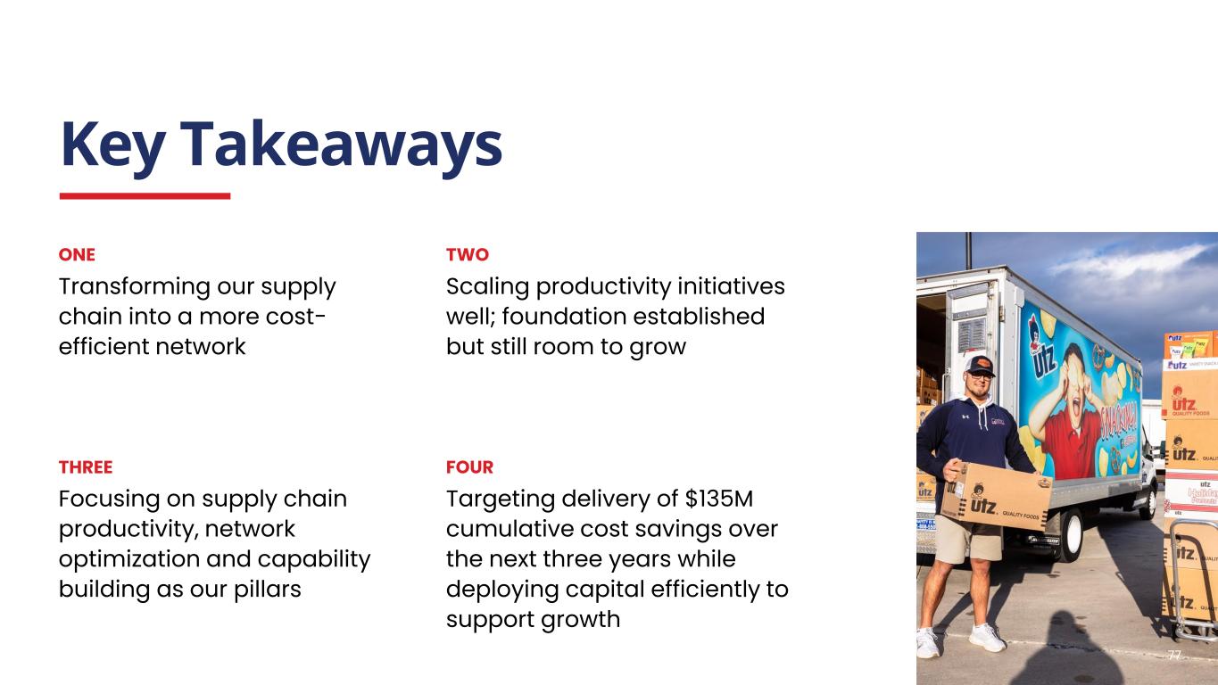 Disclaimer 2 Forward-Looking Statements Certain statements made herein are not historical facts but are “forward-looking statements” within the meaning of the “safe harbor” provisions of the Private Securities Litigation Reform Act of 1995, as amended. The forward-looking statements generally are accompanied by or include, without limitation, statements such as “will”, “expect”, “intends”, “goal” or other similar words, phrases or expressions. These forward-looking statements include the expected effects from the COVID-19 pandemic; future plans for the Utz Brands, Inc. (“the Company”), including plans related transformation of the Company’s supply chain, the Company’s geographic expansion, the Company’s product offerings and product mix, the Company’s ESG priorities, the Company’s cost savings plans and the Company’s logistics optimization efforts; the estimated or anticipated future results and benefits of the Company’s plans and operations; future capital structure; future opportunities for the Company; the effects of inflation or supply chain disruptions; statements regarding the Company’s project balance sheet and liabilities, including net leverage; and other statements that are not historical facts. These statements are based on the current expectations of the Company’s management and are not predictions of actual performance. These statements are subject to a number of risks and uncertainties and the Company’s business and actual results may differ materially. Factors that may cause such differences include, but are not limited to: the risk that the Company’s gross profit margins may be adversely impacted by a variety of factors, including variations in raw materials pricing, retail customer requirements and mix, sales velocities and required promotional support; changes in consumers’ loyalty to the Company’s brands due to factors beyond the Company’s control, including changes in consumer spending due to factors such as increasing household debt; changes in demand for the Company’s products affected by changes in consumer preferences and tastes or if the Company is unable to innovate or market its products effectively, particularly in the Company’s Expansion geographies; costs associated with building brand loyalty and interest in the Company’s products, which may be affected by actions by the Company’s competitors’ that result in the Company’s products not suitably differentiated from the products of their competitors; consolidation of key suppliers to the Company; inability of the Company to adopt efficiencies into its manufacturing processes, including automation and labor optimization, its network, including through plant consolidation and lowest landed cost for shipping its products, or its logistics operation; fluctuations in results of operations of the Company from quarter to quarter because of changes in promotional activities; the possibility that the Company may be adversely affected by other economic, business or competitive factors; the risk that the Company may not recognize the anticipated benefits of recently completed business combinations and other acquisitions recently completed by the Company (collectively, the “Business Combinations”), which may be affected by, among other things, competition and the ability of the Company to grow and manage growth profitably and retain its key employees; the ability of the Company to close planned acquisitions; changes in applicable law or regulations; costs related to the Business Combinations and other planned acquisitions; the inability of the Company to maintain the listing of the Company’s Class A Common Stock on the New York Stock Exchange; the inability of the Company to develop and maintain effective internal controls; and other risks and uncertainties set forth in the section entitled “Risk Factors” and “Forward-Looking Statements” in the Company’s Annual Report on Form 10-K filed with the U.S. Securities and Exchange Commission (the “Commission”) for the fiscal year ended January 1, 2023, and other reports filed by the Company with the Commission. In addition, forward-looking statements provide the Company’s expectations, plans or forecasts of future events and views as of the date of this communication. These forward-looking statements should not be relied upon as representing the Company’s assessments as of any date subsequent to the date of this communication. The Company cautions investors not to place undue reliance upon any forward-looking statements, which speak only as of the date made. The Company does not undertake or accept any obligation or undertaking to release publicly any updates or revisions to any forward-looking statements to reflect any change in its expectations or any change in events, conditions or circumstances on which any such statement is based, except as otherwise required by law. No Offer or Solicitation This presentation does not constitute a solicitation of a proxy, consent or authorization with respect to any securities of the Company. This presentation also does not constitute an offer to sell or the solicitation of an offer to buy securities, nor will there be any sale of securities in any state or jurisdiction in which such offer, solicitation or sale would be unlawful prior to registration or qualification under the securities laws of any such jurisdiction. No offering of securities will be made except by means of a prospectus meeting the requirements of the Securities Act of 1933, as amended, or an exemption therefrom.