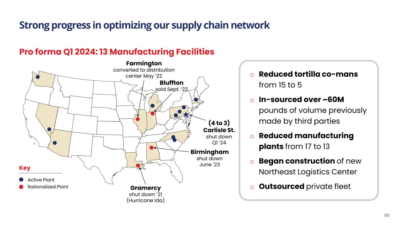 Pro forma Q1 2024: 13 Manufacturing Facilities Active Plant Rationalized Plant Key (4 to 3) Carlisle St. shut down Q1 ‘24 Bluffton sold Sept. ‘23 Birmingham shut down June ‘23 Gramercy shut down ’21 (Hurricane Ida) Farmington converted to distribution center May ‘22 Strong progress in optimizing our supply chain network 80 o Reduced tortilla co-mans from 15 to 5 o In-sourced over ~60M pounds of volume previously made by third parties o Reduced manufacturing plants from 17 to 13 o Began construction of new Northeast Logistics Center o Outsourced private fleet