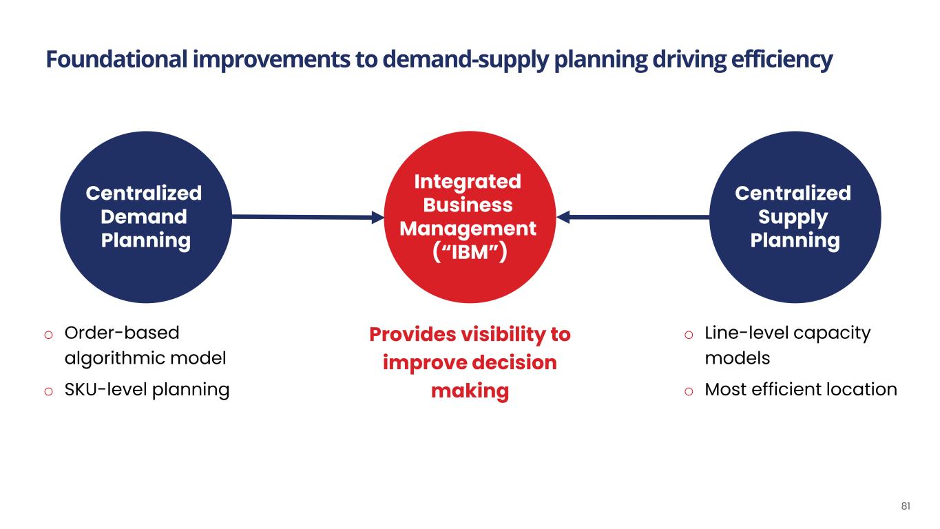 Foundational improvements to demand-supply planning driving efficiency 81 Centralized Demand Planning Centralized Supply Planning Integrated Business Management (“IBM”) o Order-based algorithmic model o SKU-level planning o Line-level capacity models o Most efficient location Provides visibility to improve decision making