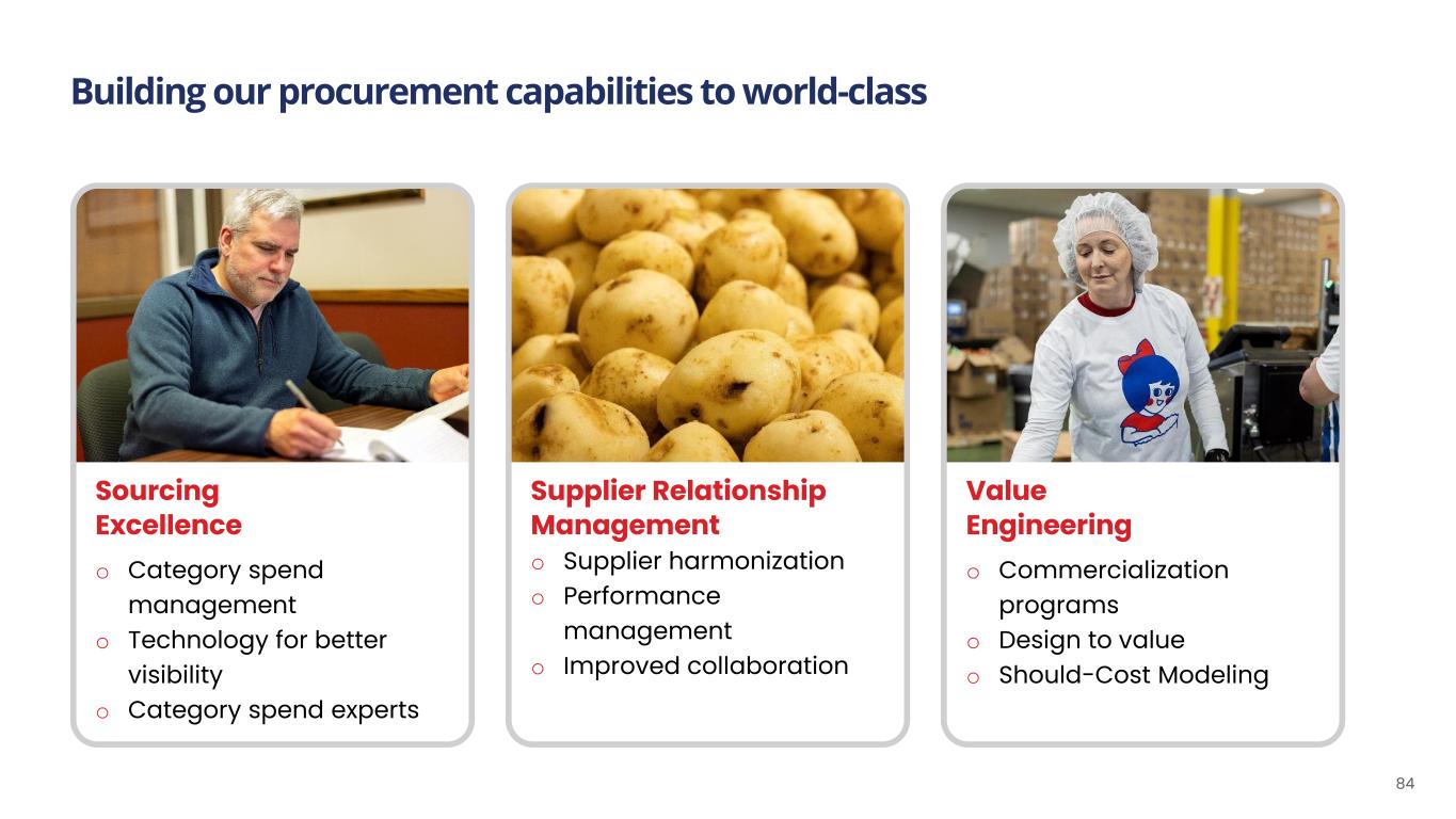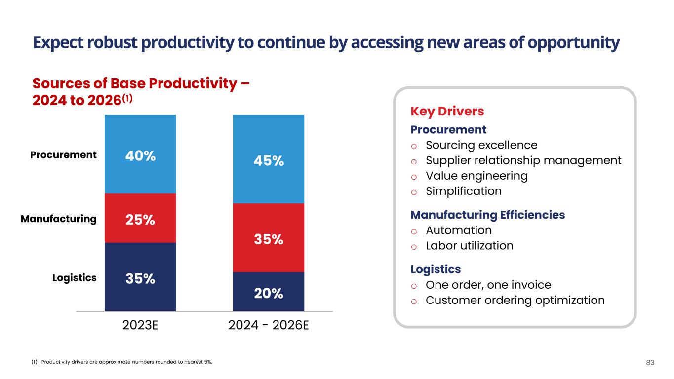 Expect robust productivity to continue by accessing new areas of opportunity 83 Sources of Base Productivity – 2024 to 2026(1) 35% 20% 25% 35% 40% 45% 2023E 2024 - 2026E Procurement Manufacturing Logistics Key Drivers Procurement o Sourcing excellence o Supplier relationship management o Value engineering o Simplification Manufacturing Efficiencies o Automation o Labor utilization Logistics o One order, one invoice o Customer ordering optimization (1) Productivity drivers are approximate numbers rounded to nearest 5%.