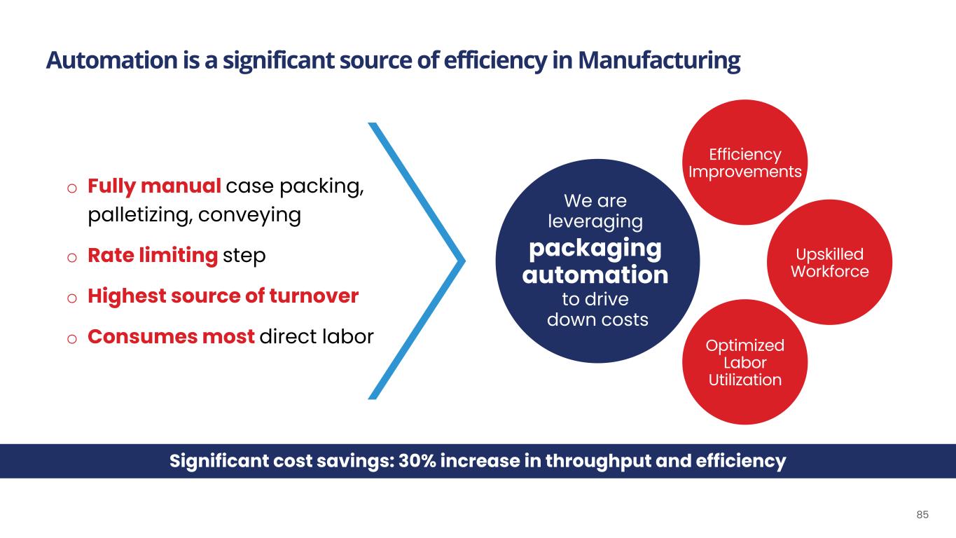 Automation is a significant source of efficiency in Manufacturing 85 Significant cost savings: 30% increase in throughput and efficiency o Fully manual case packing, palletizing, conveying o Rate limiting step o Highest source of turnover o Consumes most direct labor We are leveraging packaging automation to drive down costs Efficiency Improvements Upskilled Workforce Optimized Labor Utilization