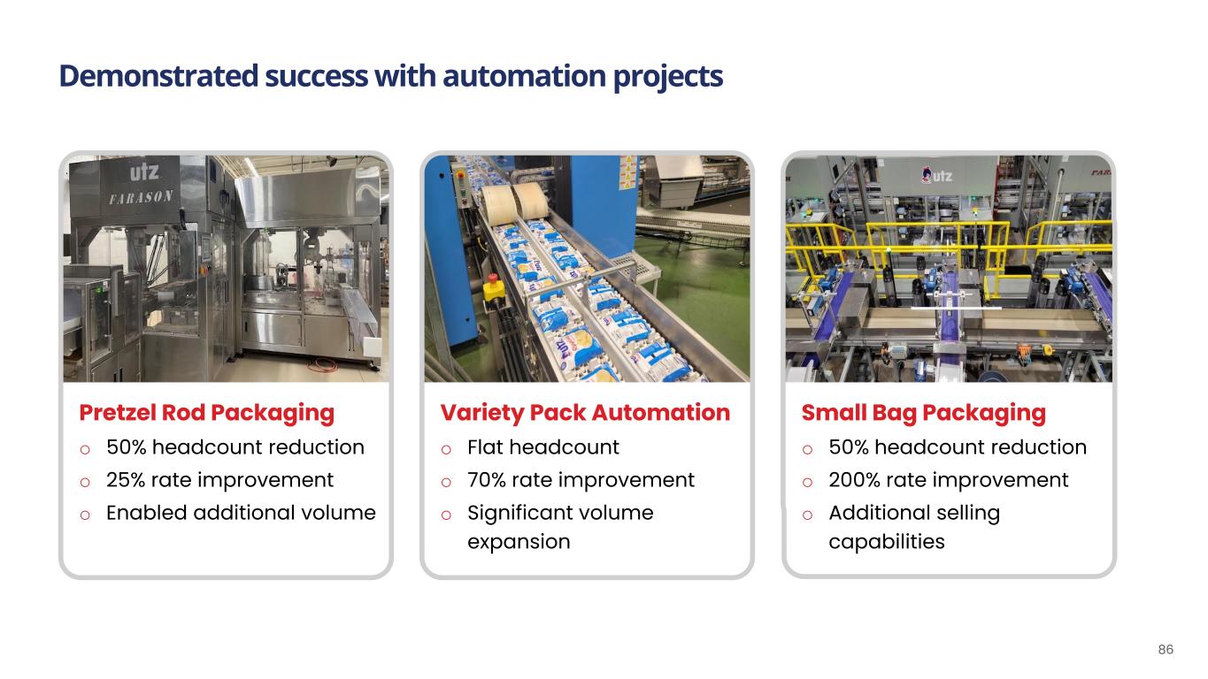 Variety Pack Automation o Flat headcount o 70% rate improvement o Significant volume expansion Small Bag Packaging o 50% headcount reduction o 200% rate improvement o Additional selling capabilities Pretzel Rod Packaging o 50% headcount reduction o 25% rate improvement o Enabled additional volume Demonstrated success with automation projects 86
