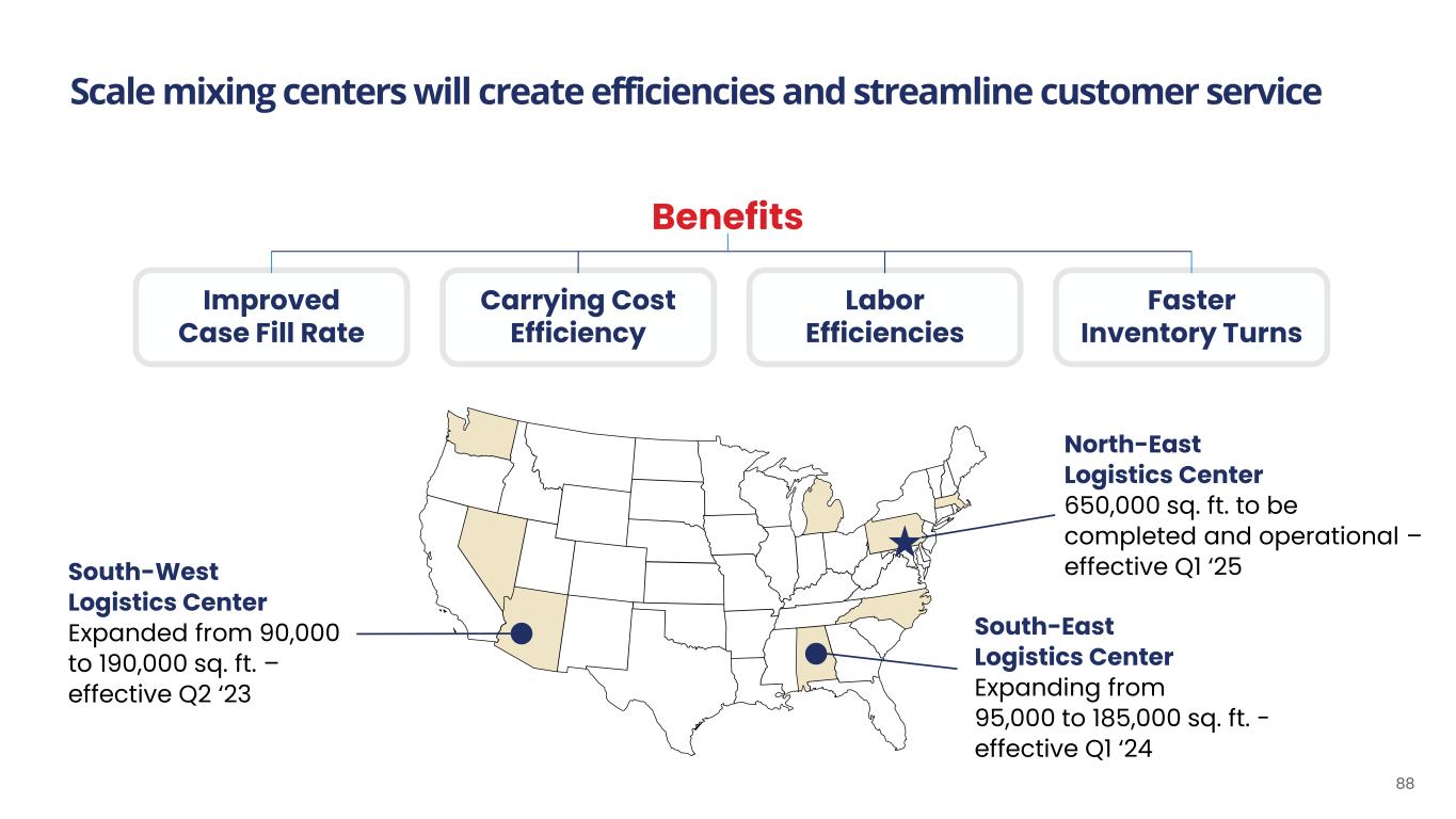 Scale mixing centers will create efficiencies and streamline customer service 88 South-West Logistics Center Expanded from 90,000 to 190,000 sq. ft. – effective Q2 ‘23 Benefits Improved Case Fill Rate Carrying Cost Efficiency Labor Efficiencies Faster Inventory Turns North-East Logistics Center 650,000 sq. ft. to be completed and operational – effective Q1 ‘25 South-East Logistics Center Expanding from 95,000 to 185,000 sq. ft. - effective Q1 ‘24
