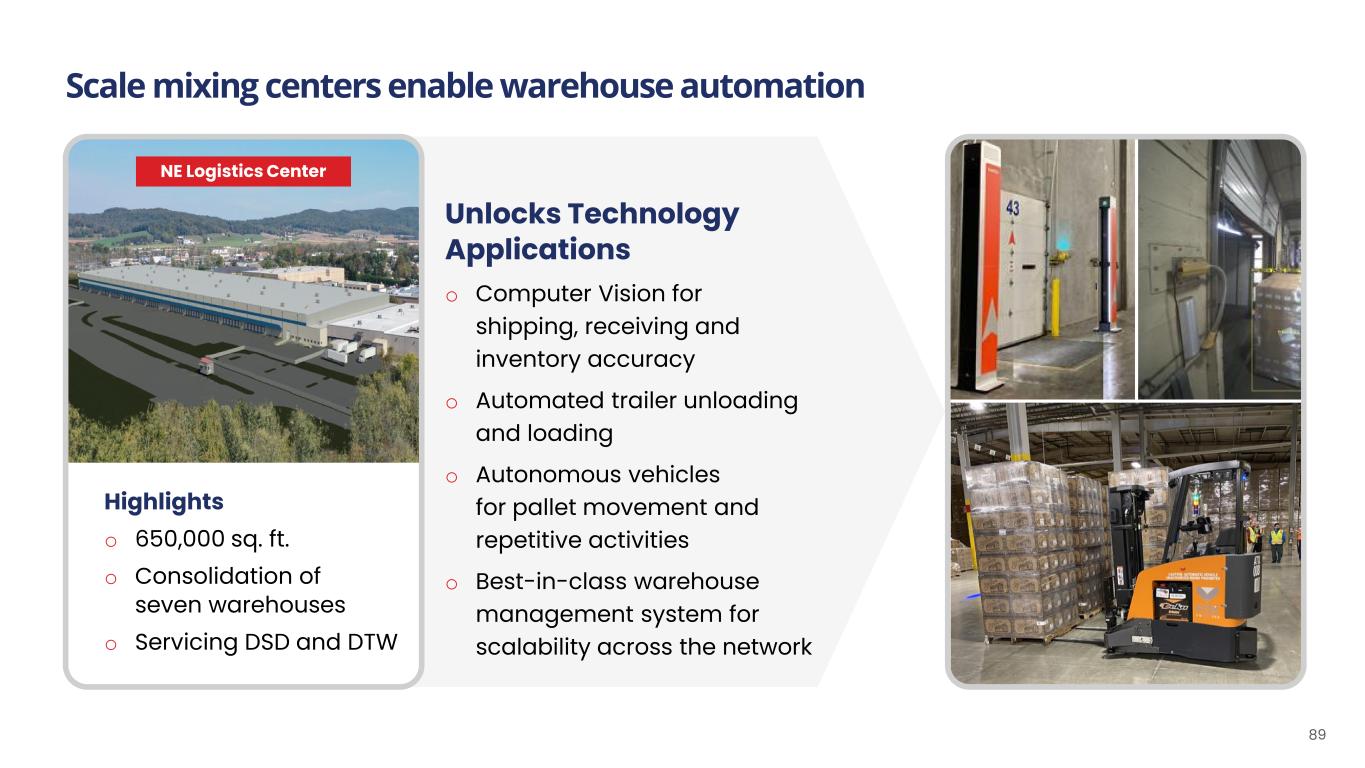 Scale mixing centers enable warehouse automation 89 Unlocks Technology Applications o Computer Vision for shipping, receiving and inventory accuracy o Automated trailer unloading and loading o Autonomous vehicles for pallet movement and repetitive activities o Best-in-class warehouse management system for scalability across the network Highlights o 650,000 sq. ft. o Consolidation of seven warehouses o Servicing DSD and DTW NE Logistics Center