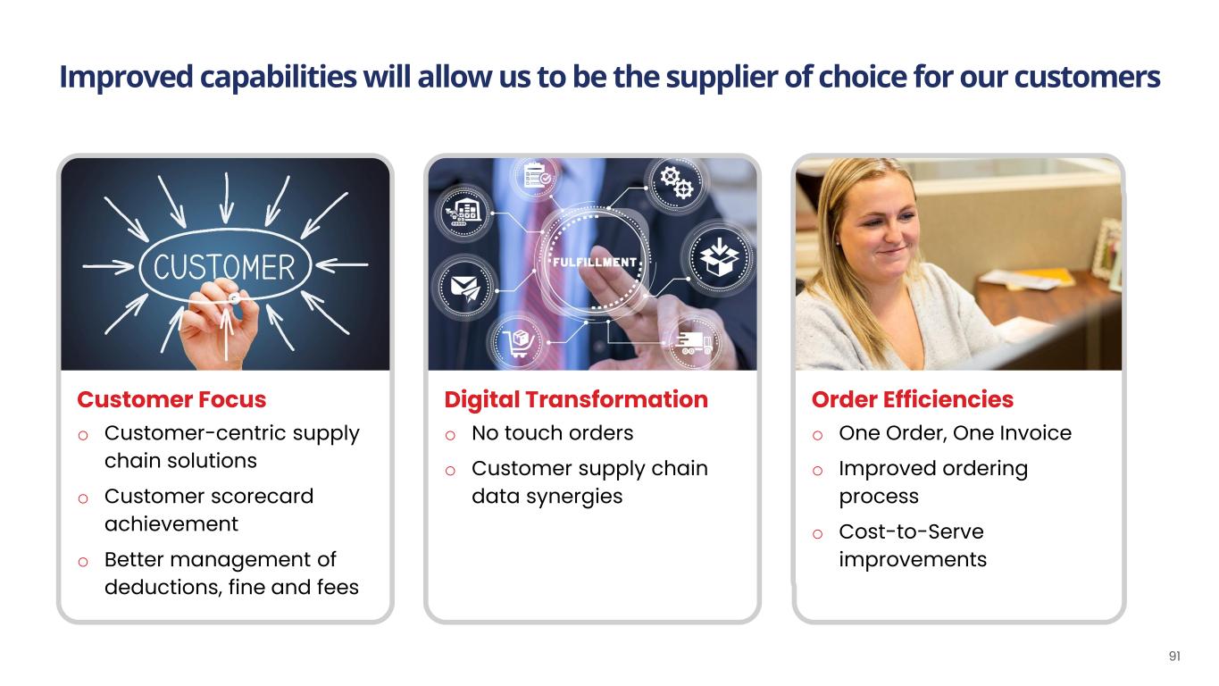 Digital Transformation o No touch orders o Customer supply chain data synergies Order Efficiencies o One Order, One Invoice o Improved ordering process o Cost-to-Serve improvements Customer Focus o Customer-centric supply chain solutions o Customer scorecard achievement o Better management of deductions, fine and fees Improved capabilities will allow us to be the supplier of choice for our customers 91
