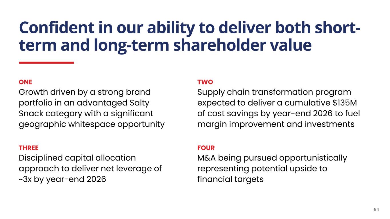 Confident in our ability to deliver both short- term and long-term shareholder value 94 Growth driven by a strong brand portfolio in an advantaged Salty Snack category with a significant geographic whitespace opportunity ONE Disciplined capital allocation approach to deliver net leverage of ~3x by year-end 2026 THREE Supply chain transformation program expected to deliver a cumulative $135M of cost savings by year-end 2026 to fuel margin improvement and investments TWO M&A being pursued opportunistically representing potential upside to financial targets FOUR