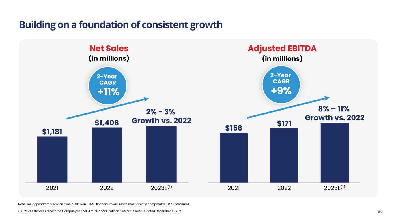 Building on a foundation of consistent growth 95 $1,181 $1,408 2021 2022 2023E(1) 2% - 3% Growth vs. 2022 $156 $171 2021 2022 2023E(1) 8% – 11% Growth vs. 2022 Net Sales Adjusted EBITDA Note: See appendix for reconciliation of Utz Non-GAAP financial measures to most directly comparable GAAP measures. (1) 2023 estimates reflect the Company’s fiscal 2023 financial outlook. See press release dated December 15, 2023. (in millions) (in millions) 2-Year CAGR +11% 2-Year CAGR +9%