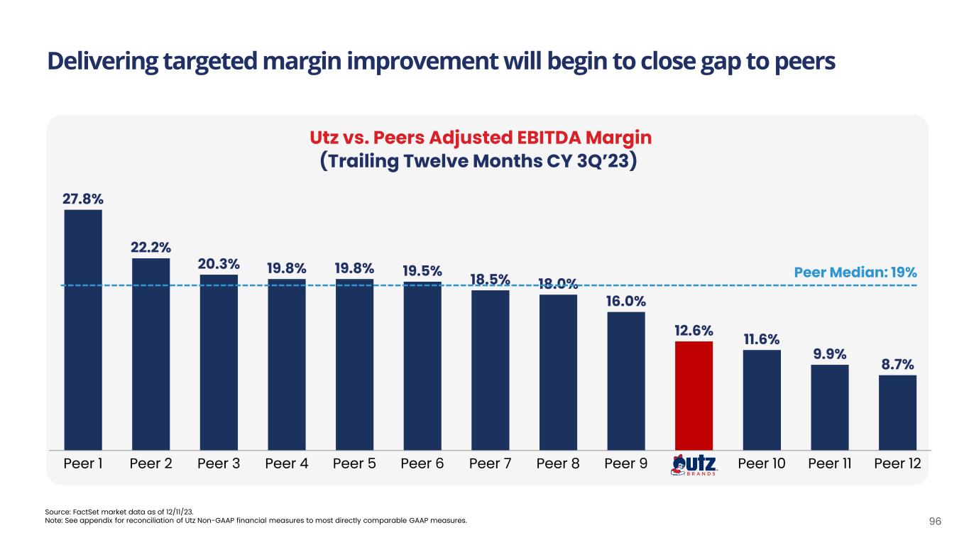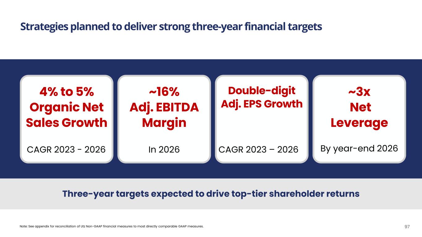 Delivering targeted margin improvement will begin to close gap to peers 96 Peer 2 Peer 3 Peer 4 Peer 5 Peer 6 Peer 7 Peer 8 Peer 9 Peer 10 Peer 11 Peer 12 27.8% Peer 1 20.3% 19.8% 19.8% 19.5% 18.5% 18.0% 16.0% 12.6% 11.6% 9.9% 8.7% 22.2% Peer Median: 19% Utz vs. Peers Adjusted EBITDA Margin Source: FactSet market data as of 12/11/23. Note: See appendix for reconciliation of Utz Non-GAAP financial measures to most directly comparable GAAP measures. (Trailing Twelve Months CY 3Q’23)