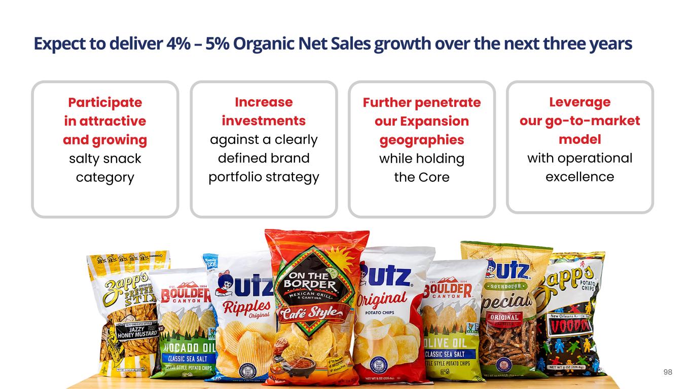 Increase investments against a clearly defined brand portfolio strategy Leverage our go-to-market model with operational excellence Expect to deliver 4% – 5% Organic Net Sales growth over the next three years 98 Further penetrate our Expansion geographies while holding the Core Participate in attractive and growing salty snack category