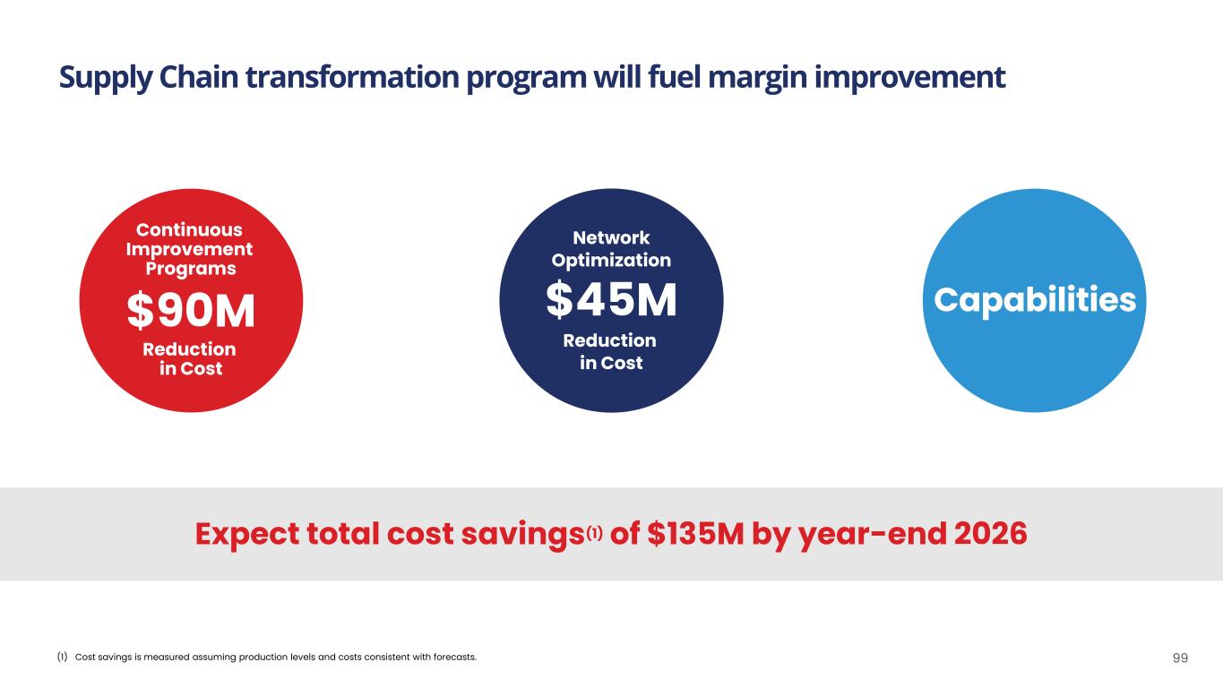 Expect total cost savings(1) of $135M by year-end 2026 Supply Chain transformation program will fuel margin improvement 99 Continuous Improvement Programs $90M Reduction in Cost Capabilities Network Optimization $45M Reduction in Cost (1) Cost savings is measured assuming production levels and costs consistent with forecasts.