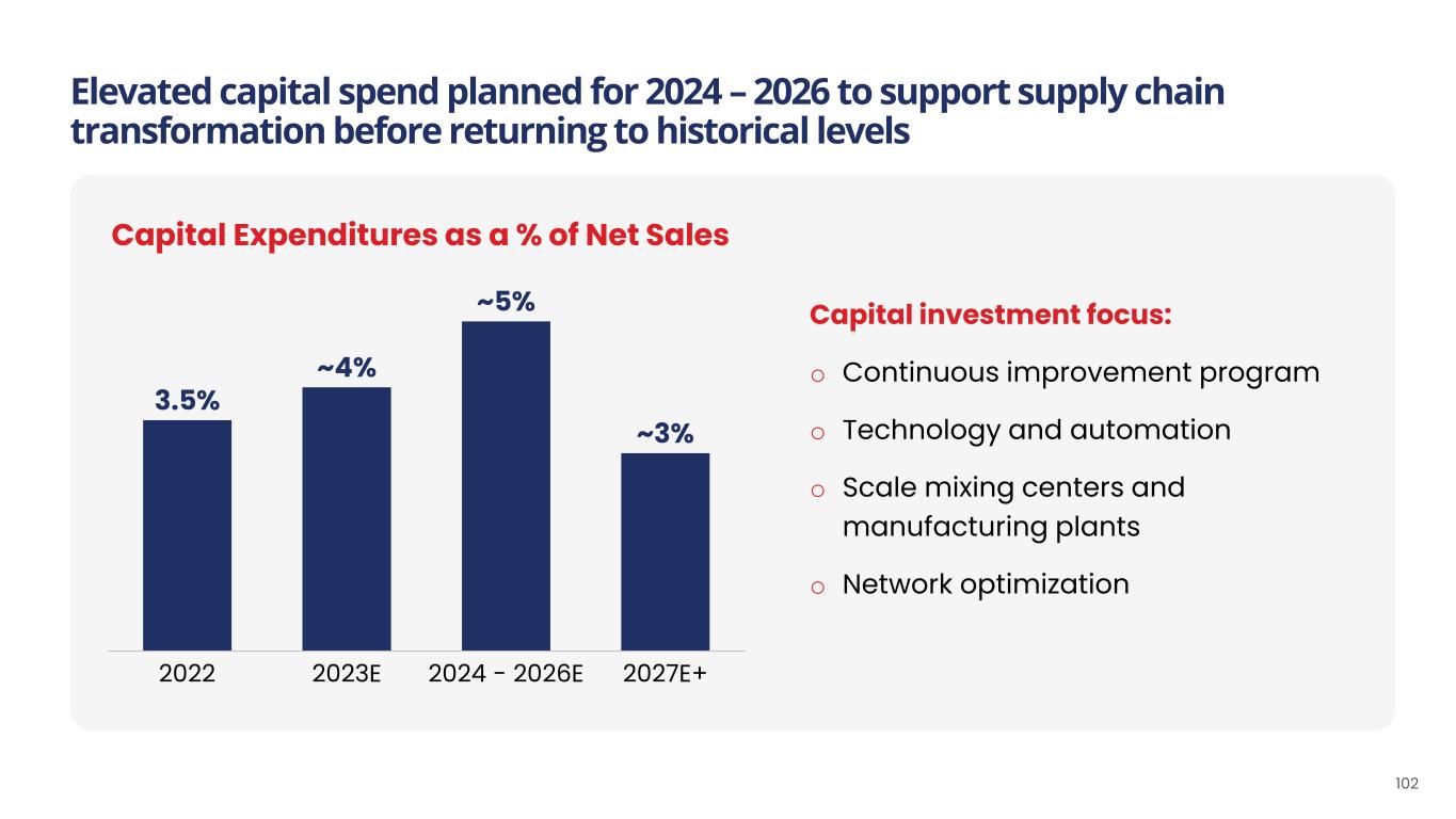 Capital investment focus: o Continuous improvement program o Technology and automation o Scale mixing centers and manufacturing plants o Network optimization Elevated capital spend planned for 2024 – 2026 to support supply chain transformation before returning to historical levels 102 2022 2023E 2024 - 2026E 2027E+ 3.5% ~4% ~5% ~3% Capital Expenditures as a % of Net Sales