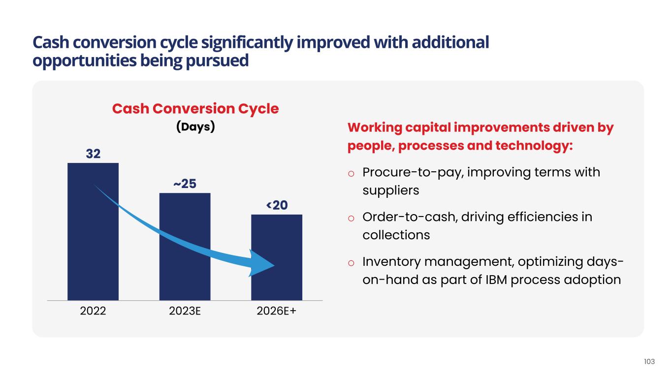 Working capital improvements driven by people, processes and technology: o Procure-to-pay, improving terms with suppliers o Order-to-cash, driving efficiencies in collections o Inventory management, optimizing days- on-hand as part of IBM process adoption Cash Conversion Cycle (Days) Cash conversion cycle significantly improved with additional opportunities being pursued 103 32 2022 2023E 2026E+ ~25 <20
