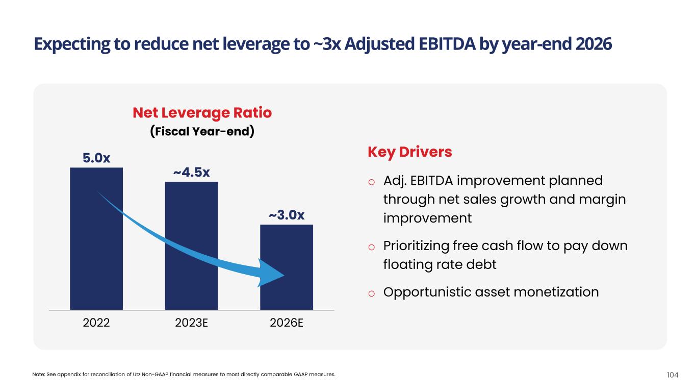 Key Drivers o Adj. EBITDA improvement planned through net sales growth and margin improvement o Prioritizing free cash flow to pay down floating rate debt o Opportunistic asset monetization Net Leverage Ratio (Fiscal Year-end) Expecting to reduce net leverage to ~3x Adjusted EBITDA by year-end 2026 104 2023E 2026E2022 ~4.5x ~3.0x 5.0x Note: See appendix for reconciliation of Utz Non-GAAP financial measures to most directly comparable GAAP measures.