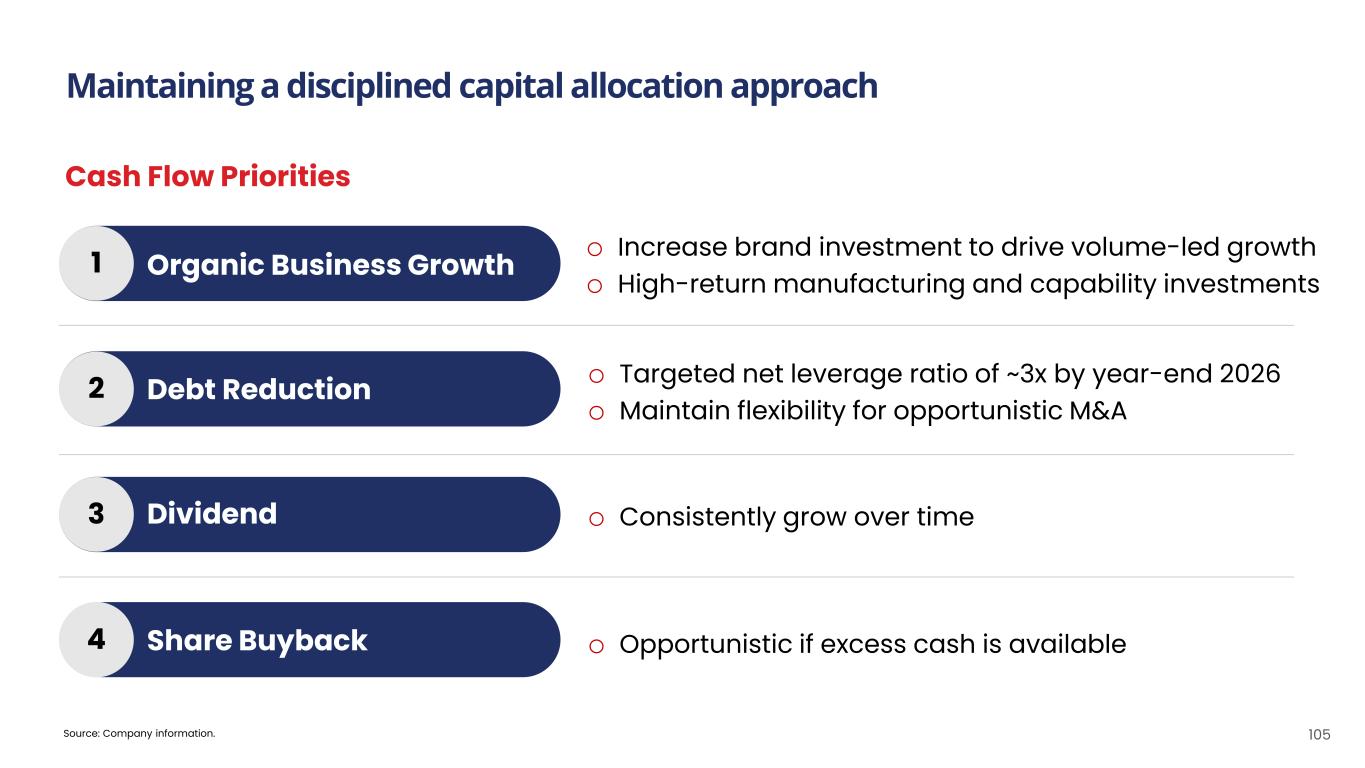 Maintaining a disciplined capital allocation approach 105 1 Organic Business Growth 2 Debt Reduction 3 Dividend 4 Share Buyback o Increase brand investment to drive volume-led growth o High-return manufacturing and capability investments o Targeted net leverage ratio of ~3x by year-end 2026 o Maintain flexibility for opportunistic M&A o Consistently grow over time o Opportunistic if excess cash is available Source: Company information. Cash Flow Priorities