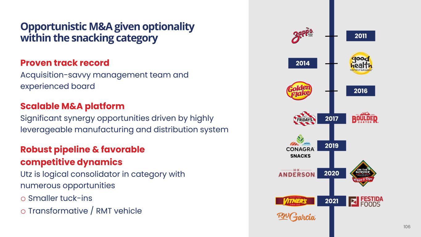 Opportunistic M&A given optionality within the snacking category 106 Proven track record Acquisition-savvy management team and experienced board Scalable M&A platform Significant synergy opportunities driven by highly leverageable manufacturing and distribution system Robust pipeline & favorable competitive dynamics Utz is logical consolidator in category with numerous opportunities o Smaller tuck-ins o Transformative / RMT vehicle 2011 2014 2016 2017 2019 2020 2021 SNACKS