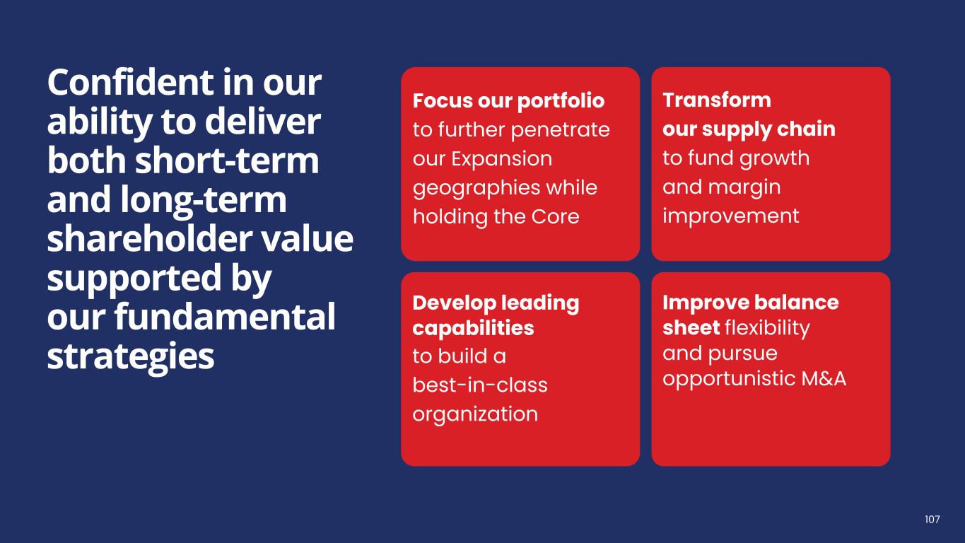 Confident in our ability to deliver both short-term and long-term shareholder value supported by our fundamental strategies 107 Focus our portfolio to further penetrate our Expansion geographies while holding the Core Transform our supply chain to fund growth and margin improvement Develop leading capabilities to build a best-in-class organization Improve balance sheet flexibility and pursue opportunistic M&A