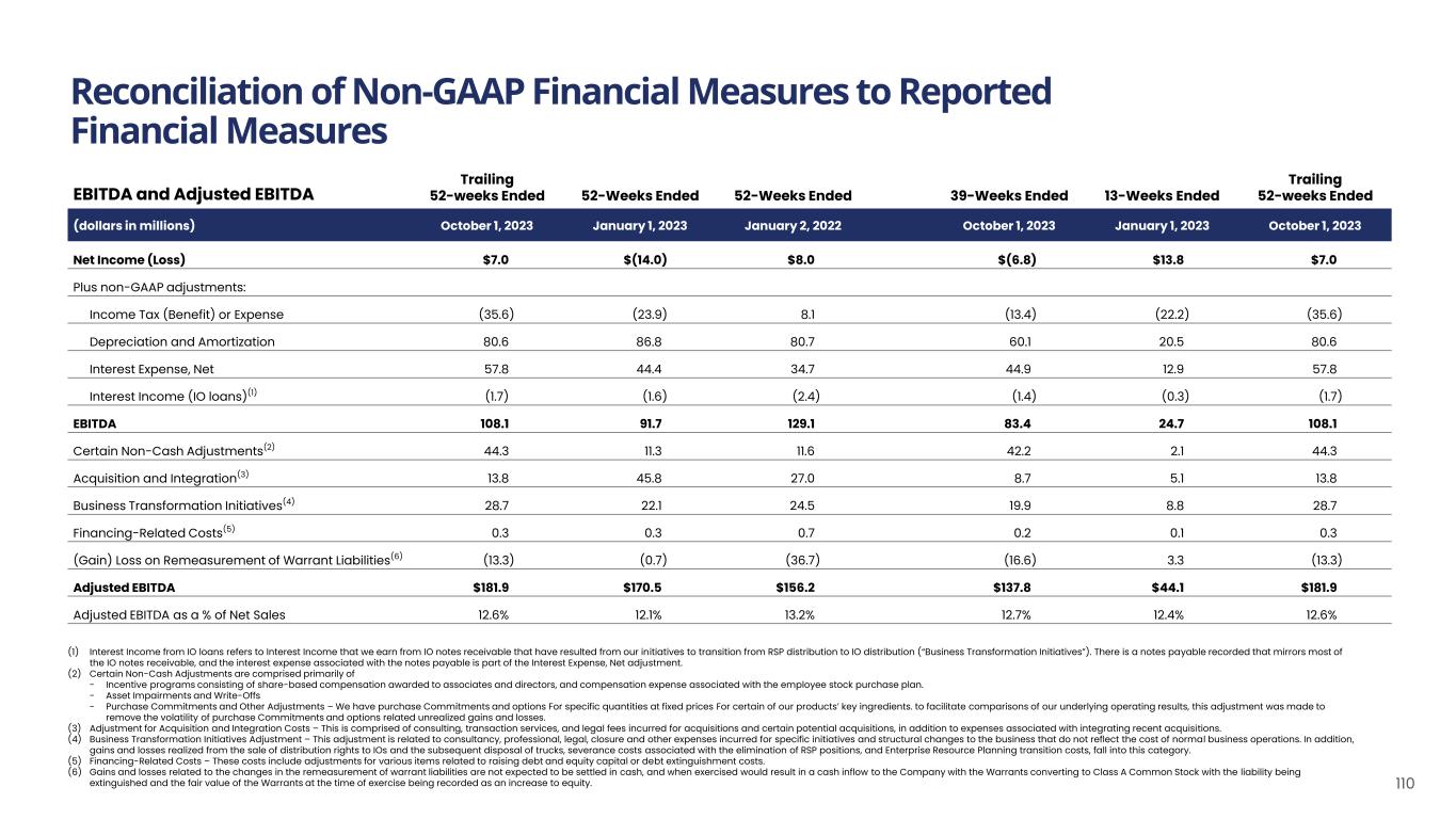Reconciliation of Non-GAAP Financial Measures to Reported Financial Measures 110 (1) Interest Income from IO loans refers to Interest Income that we earn from IO notes receivable that have resulted from our initiatives to transition from RSP distribution to IO distribution (“Business Transformation Initiatives”). There is a notes payable recorded that mirrors most of the IO notes receivable, and the interest expense associated with the notes payable is part of the Interest Expense, Net adjustment. (2) Certain Non-Cash Adjustments are comprised primarily of - Incentive programs consisting of share-based compensation awarded to associates and directors, and compensation expense associated with the employee stock purchase plan. - Asset Impairments and Write-Offs - Purchase Commitments and Other Adjustments – We have purchase Commitments and options For specific quantities at fixed prices For certain of our products’ key ingredients. to facilitate comparisons of our underlying operating results, this adjustment was made to remove the volatility of purchase Commitments and options related unrealized gains and losses. (3) Adjustment for Acquisition and Integration Costs – This is comprised of consulting, transaction services, and legal fees incurred for acquisitions and certain potential acquisitions, in addition to expenses associated with integrating recent acquisitions. (4) Business Transformation Initiatives Adjustment – This adjustment is related to consultancy, professional, legal, closure and other expenses incurred for specific initiatives and structural changes to the business that do not reflect the cost of normal business operations. In addition, gains and losses realized from the sale of distribution rights to IOs and the subsequent disposal of trucks, severance costs associated with the elimination of RSP positions, and Enterprise Resource Planning transition costs, fall into this category. (5) Financing-Related Costs – These costs include adjustments for various items related to raising debt and equity capital or debt extinguishment costs. (6) Gains and losses related to the changes in the remeasurement of warrant liabilities are not expected to be settled in cash, and when exercised would result in a cash inflow to the Company with the Warrants converting to Class A Common Stock with the liability being extinguished and the fair value of the Warrants at the time of exercise being recorded as an increase to equity. EBITDA and Adjusted EBITDA Trailing 52-weeks Ended 52-Weeks Ended 52-Weeks Ended 39-Weeks Ended 13-Weeks Ended Trailing 52-weeks Ended (dollars in millions) October 1, 2023 January 1, 2023 January 2, 2022 October 1, 2023 January 1, 2023 October 1, 2023 Net Income (Loss) $7.0 $(14.0) $8.0 $(6.8) $13.8 $7.0 Plus non-GAAP adjustments: Income Tax (Benefit) or Expense (35.6) (23.9) 8.1 (13.4) (22.2) (35.6) Depreciation and Amortization 80.6 86.8 80.7 60.1 20.5 80.6 Interest Expense, Net 57.8 44.4 34.7 44.9 12.9 57.8 Interest Income (IO loans)(1) (1.7) (1.6) (2.4) (1.4) (0.3) (1.7) EBITDA 108.1 91.7 129.1 83.4 24.7 108.1 Certain Non-Cash Adjustments(2) 44.3 11.3 11.6 42.2 2.1 44.3 Acquisition and Integration(3) 13.8 45.8 27.0 8.7 5.1 13.8 Business Transformation Initiatives(4) 28.7 22.1 24.5 19.9 8.8 28.7 Financing-Related Costs(5) 0.3 0.3 0.7 0.2 0.1 0.3 (Gain) Loss on Remeasurement of Warrant Liabilities(6) (13.3) (0.7) (36.7) (16.6) 3.3 (13.3) Adjusted EBITDA $181.9 $170.5 $156.2 $137.8 $44.1 $181.9 Adjusted EBITDA as a % of Net Sales 12.6% 12.1% 13.2% 12.7% 12.4% 12.6%