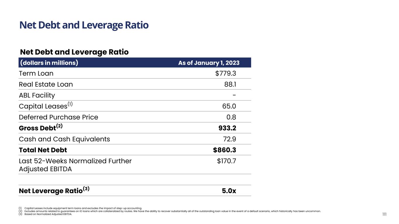 Net Debt and Leverage Ratio 111 (1) Capital Leases include equipment term loans and excludes the impact of step-up accounting. (2) Excludes amounts related to guarantees on IO loans which are collateralized by routes. We have the ability to recover substantially all of the outstanding loan value in the event of a default scenario, which historically has been uncommon. (3) Based on Normalized Adjusted EBITDA. Net Debt and Leverage Ratio (dollars in millions) As of January 1, 2023 Term Loan $779.3 Real Estate Loan 88.1 ABL Facility - Capital Leases(1) 65.0 Deferred Purchase Price 0.8 Gross Debt(2) 933.2 Cash and Cash Equivalents 72.9 Total Net Debt $860.3 Last 52-Weeks Normalized Further Adjusted EBITDA $170.7 Net Leverage Ratio(3) 5.0x