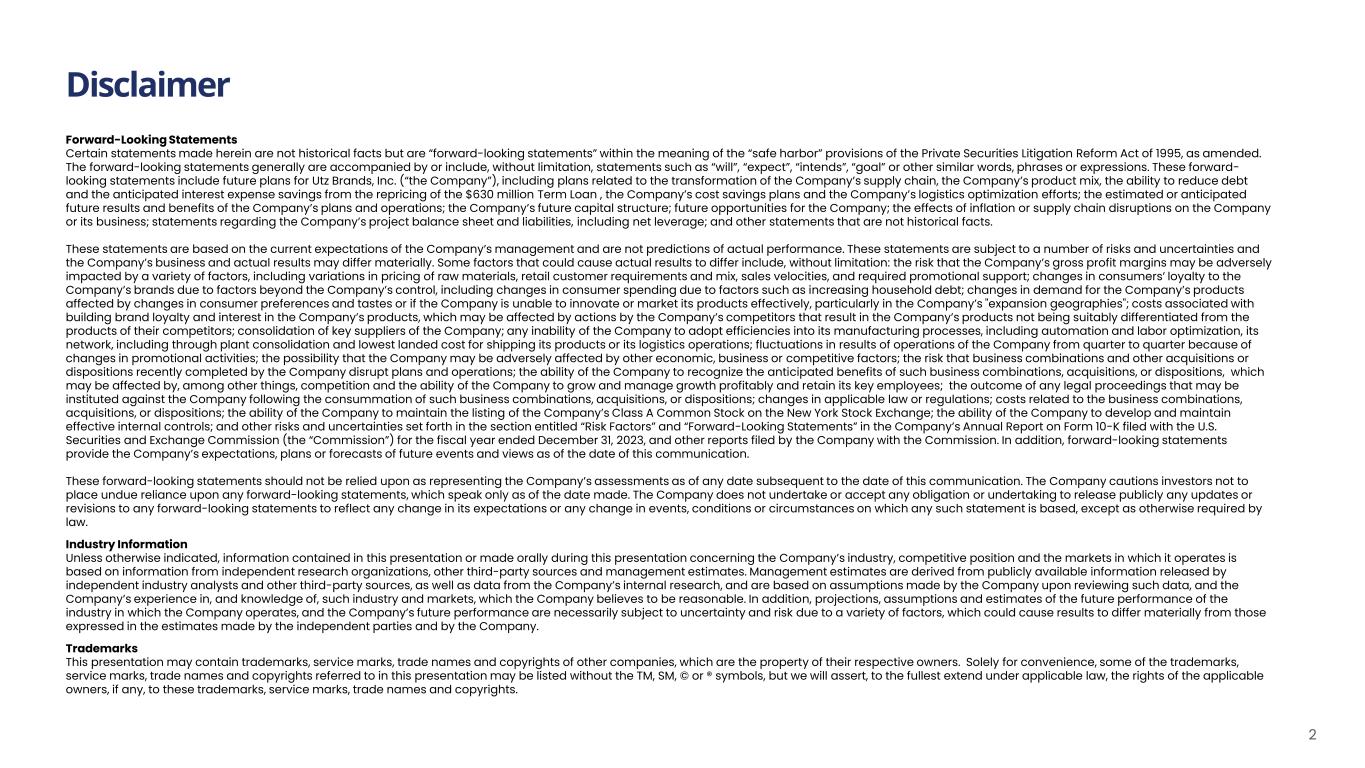 Disclaimer 2 Forward-Looking Statements Certain statements made herein are not historical facts but are “forward-looking statements” within the meaning of the “safe harbor” provisions of the Private Securities Litigation Reform Act of 1995, as amended. The forward-looking statements generally are accompanied by or include, without limitation, statements such as “will”, “expect”, “intends”, “goal” or other similar words, phrases or expressions. These forward- looking statements include future plans for Utz Brands, Inc. (“the Company”), including plans related to the transformation of the Company’s supply chain, the Company’s product mix, the ability to reduce debt and the anticipated interest expense savings from the repricing of the $630 million Term Loan , the Company’s cost savings plans and the Company’s logistics optimization efforts; the estimated or anticipated future results and benefits of the Company’s plans and operations; the Company’s future capital structure; future opportunities for the Company; the effects of inflation or supply chain disruptions on the Company or its business; statements regarding the Company’s project balance sheet and liabilities, including net leverage; and other statements that are not historical facts. These statements are based on the current expectations of the Company’s management and are not predictions of actual performance. These statements are subject to a number of risks and uncertainties and the Company’s business and actual results may differ materially. Some factors that could cause actual results to differ include, without limitation: the risk that the Company’s gross profit margins may be adversely impacted by a variety of factors, including variations in pricing of raw materials, retail customer requirements and mix, sales velocities, and required promotional support; changes in consumers’ loyalty to the Company’s brands due to factors beyond the Company’s control, including changes in consumer spending due to factors such as increasing household debt; changes in demand for the Company’s products affected by changes in consumer preferences and tastes or if the Company is unable to innovate or market its products effectively, particularly in the Company’s "expansion geographies"; costs associated with building brand loyalty and interest in the Company’s products, which may be affected by actions by the Company’s competitors that result in the Company’s products not being suitably differentiated from the products of their competitors; consolidation of key suppliers of the Company; any inability of the Company to adopt efficiencies into its manufacturing processes, including automation and labor optimization, its network, including through plant consolidation and lowest landed cost for shipping its products or its logistics operations; fluctuations in results of operations of the Company from quarter to quarter because of changes in promotional activities; the possibility that the Company may be adversely affected by other economic, business or competitive factors; the risk that business combinations and other acquisitions or dispositions recently completed by the Company disrupt plans and operations; the ability of the Company to recognize the anticipated benefits of such business combinations, acquisitions, or dispositions, which may be affected by, among other things, competition and the ability of the Company to grow and manage growth profitably and retain its key employees; the outcome of any legal proceedings that may be instituted against the Company following the consummation of such business combinations, acquisitions, or dispositions; changes in applicable law or regulations; costs related to the business combinations, acquisitions, or dispositions; the ability of the Company to maintain the listing of the Company’s Class A Common Stock on the New York Stock Exchange; the ability of the Company to develop and maintain effective internal controls; and other risks and uncertainties set forth in the section entitled “Risk Factors” and “Forward-Looking Statements” in the Company’s Annual Report on Form 10-K filed with the U.S. Securities and Exchange Commission (the “Commission”) for the fiscal year ended December 31, 2023, and other reports filed by the Company with the Commission. In addition, forward-looking statements provide the Company’s expectations, plans or forecasts of future events and views as of the date of this communication. These forward-looking statements should not be relied upon as representing the Company’s assessments as of any date subsequent to the date of this communication. The Company cautions investors not to place undue reliance upon any forward-looking statements, which speak only as of the date made. The Company does not undertake or accept any obligation or undertaking to release publicly any updates or revisions to any forward-looking statements to reflect any change in its expectations or any change in events, conditions or circumstances on which any such statement is based, except as otherwise required by law. Industry Information Unless otherwise indicated, information contained in this presentation or made orally during this presentation concerning the Company’s industry, competitive position and the markets in which it operates is based on information from independent research organizations, other third-party sources and management estimates. Management estimates are derived from publicly available information released by independent industry analysts and other third-party sources, as well as data from the Company’s internal research, and are based on assumptions made by the Company upon reviewing such data, and the Company’s experience in, and knowledge of, such industry and markets, which the Company believes to be reasonable. In addition, projections, assumptions and estimates of the future performance of 