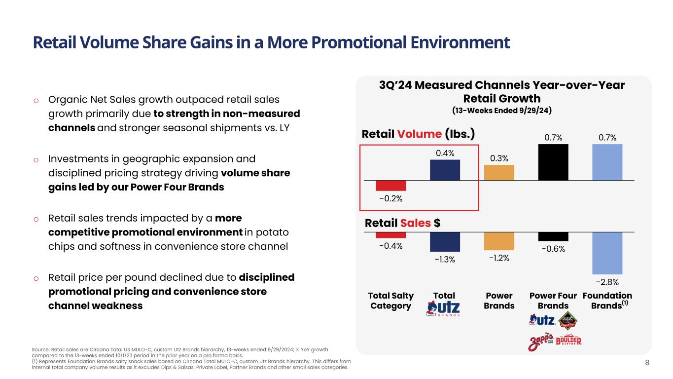 Strong Execution Against a Clearly Defined Portfolio Strategy Power Brand (1) volume increased ~4% in 3Q’24 7 o Strong Power Brand(1) volume led by On The Border® and Boulder Canyon® o Strong performance in non-measured channels, e.g., club, natural, dollar stores, e-commerce, etc., with branded volume year-over-year growth of ~8% o Increasing our marketing investments while managing our promotional spend o Foundation Brands(2) volume continuing to be impacted by dips and salsa declines and purposeful de-emphasis of co-manufacturing 79% 21% 3Q’24 Measured + Unmeasured Channels Volume Breakdown(lbs.)(3) Year-over-Year Change Power Brands(1) Foundation Brands(2) +4% -7% (1) Total Company Power Brands include Utz®, On The Border®, Zapp’s®, Boulder Canyon®, Golden Flake® Pork, TGI Fridays®, Hawaiian®, Tim’s Cascade®, TORTYAHS®, Dirty®, and Jax®. (2) Total Company Foundation Brands include Golden Flake® ex-Pork, Snyder of Berlin®, Bachman®, H.K. Anderson®, Vitner’s®, Kitchen Cooked®, Wachusett®, and other small brands, and also includes Partner Brands, Private Label, Co-Manufacturing, and Utz Branded non-salty snacks such as On The Border® Dips and Salsa. (3) Source: Total company volume. Internal company data.